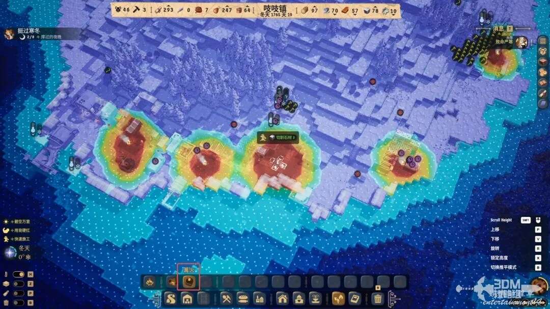 在此期間可以簡單熟悉一每個快速鍵的作用,例如H可以查看溫度,按Z可以進入刨面圖,按P查看污染指數(前期暫時用不到),按B拆除建築,按MN快速規劃採集區域,按C複製建築。