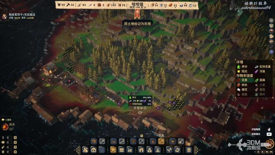 到後面我才想起來農田這一茬;打開農田介面,可以看到地圖上的不同顏色,綠色越深就代表土壤越肥沃,選擇最綠的地方規劃農田區域;