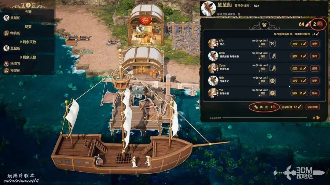 稍稍等一會兒,下一艘鼠鼠船來了,此時我們沒有足夠的政策支持點數,只能拿去兩隻鼠鼠,前期推薦選擇礦工工會和探險家工會的鼠鼠用於資源開採。