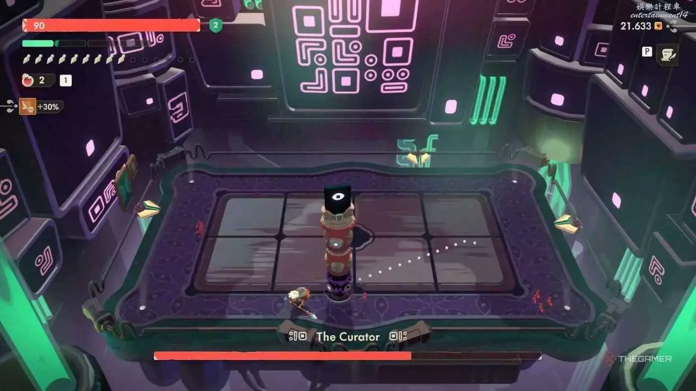 在這場戰鬥中,你需要時刻關注塔狀生物“館長”,以及競技場兩側和頂部的三個裝置。前者是你需要射擊和攻擊的武器,後者則是在戰鬥中投擲小型投射物。