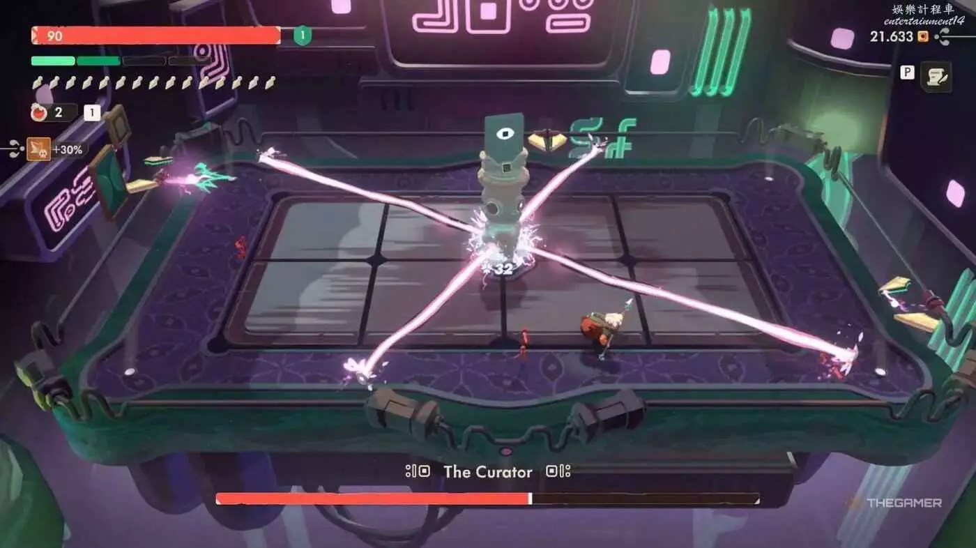 你會注意到競技場中央有高亮的線條。館長會點亮一條線,然後朝那個方向移動,並用鐳射攻擊自己周圍。遊戲的理念是,你在Boss發出光芒和它朝那個方向移動之間的四秒內攻擊它。