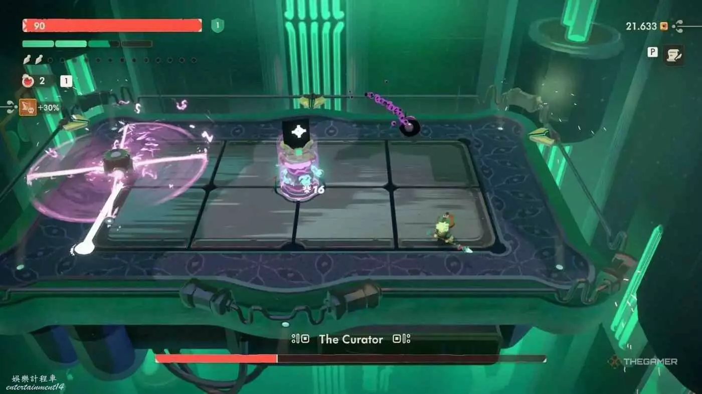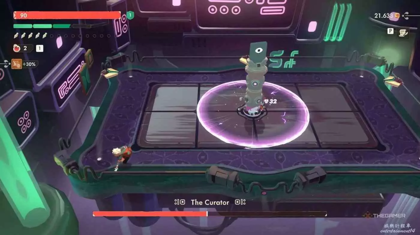 當館長生命值耗盡約20%時,會形成更長的垂直線條,因此要注意攻擊範圍。你需要攻擊Boss直到下半部變紫色,然後用背包摧毀它。