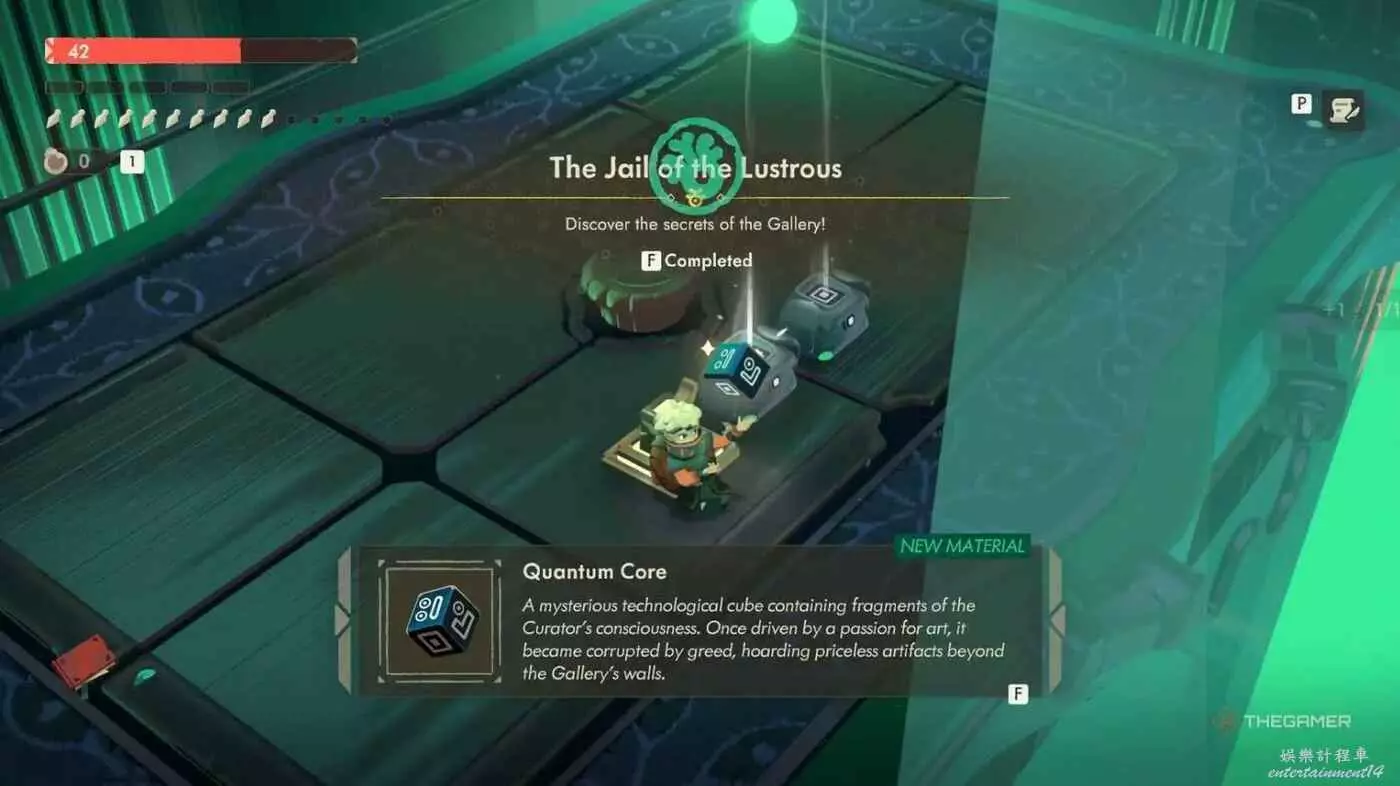 擊敗館長後,你將獲得兩個寶箱和一種新材料:量子核心。你可以用這個製作爆光束槍。此外,完成戰鬥後,你會完成支線任務“光輝監獄”,並獲得來自巴比爾的“整流劑”配方。