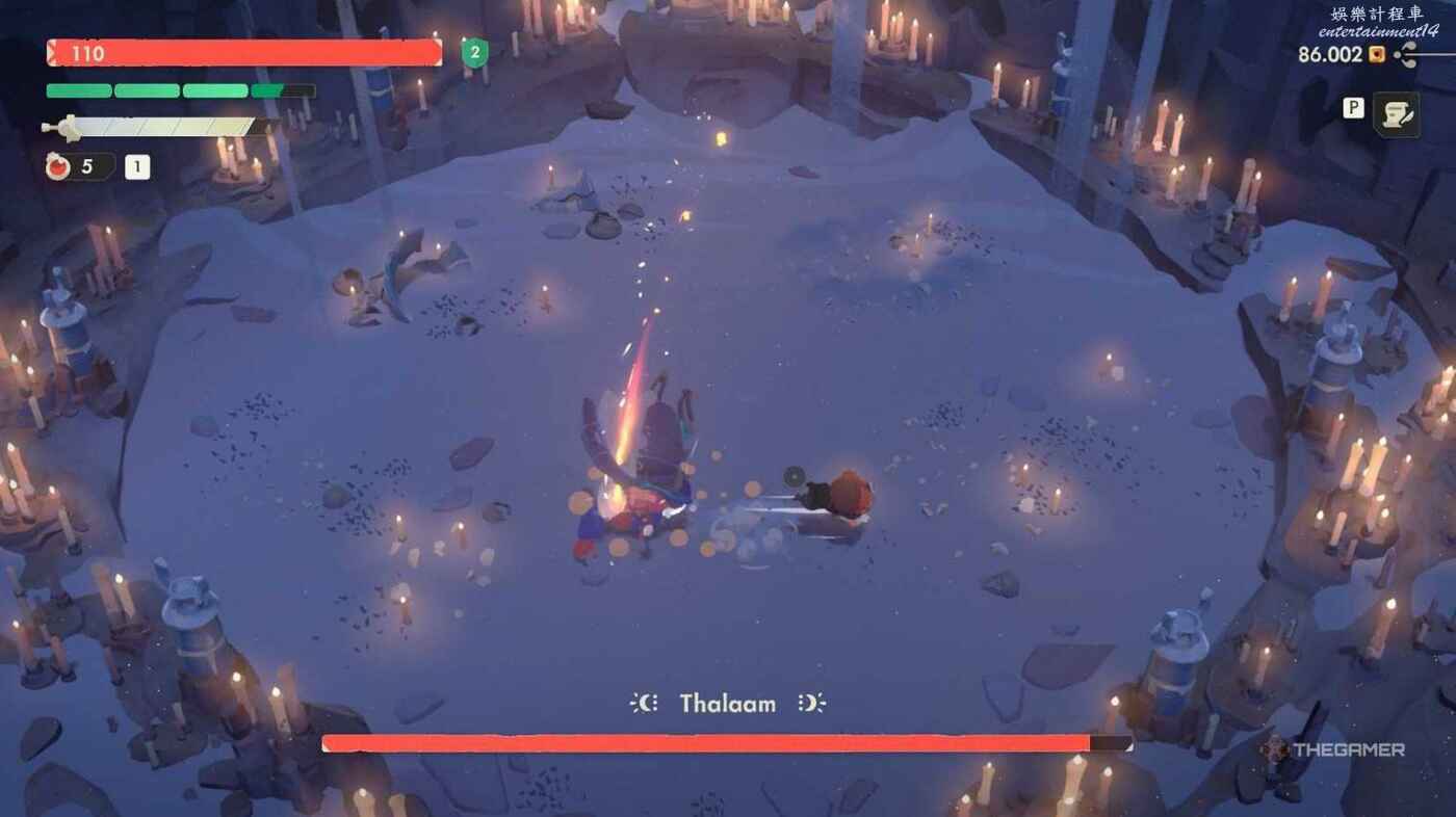 你投擲的每個投擲物之間,Thalaam會執行不同的攻擊。首先,他會發出衝擊波,你需要跳過去。然後,他會開始投擲火焰彈,幾秒後爆炸——看看紅色圓圈顯示爆炸區域。最後,當你試圖命中最後一個投射物時,他會在兩者之間切換。