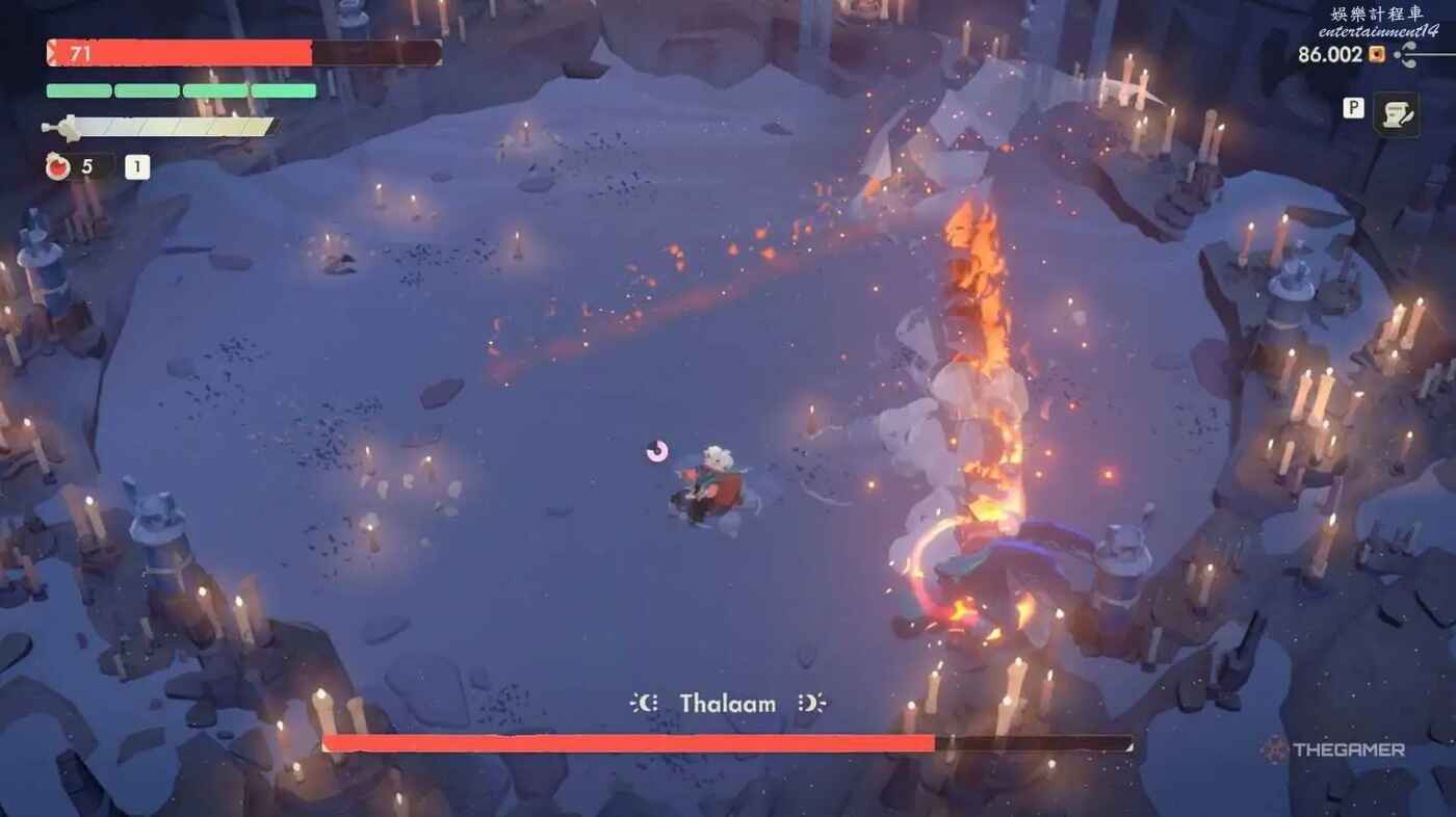 例如,他的踩踏會留下持續幾秒的火焰軌跡,他還會再進行一次踩踏(共四次)。現在,每次Boss跳躍並重重摔地時,Thalaam也會投擲許多火焰彈,幾秒鐘後爆炸。