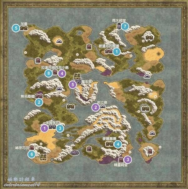 套裝部件隨主線進度逐步解鎖(地圖標註紫底數字為裝備位置,藍底數字為頭盔任務線)