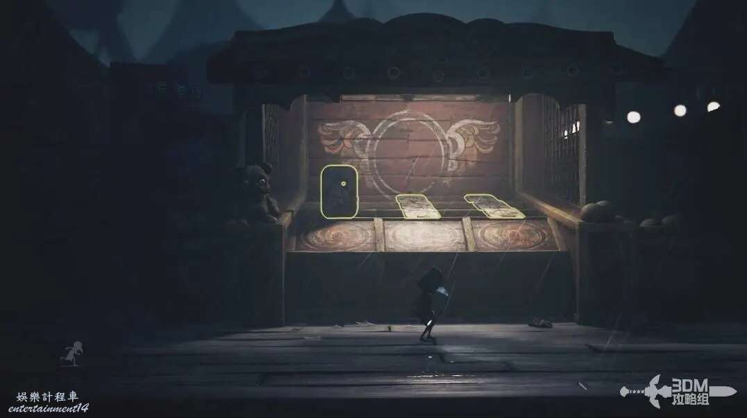 稍微走過來一段距離能看到這裡有一個遊樂園的小遊戲。這個遊戲需要我們射擊彈出來的鐵板,規則很簡單,看到三角頭圖案就射擊,看到小女孩圖案就跳過。