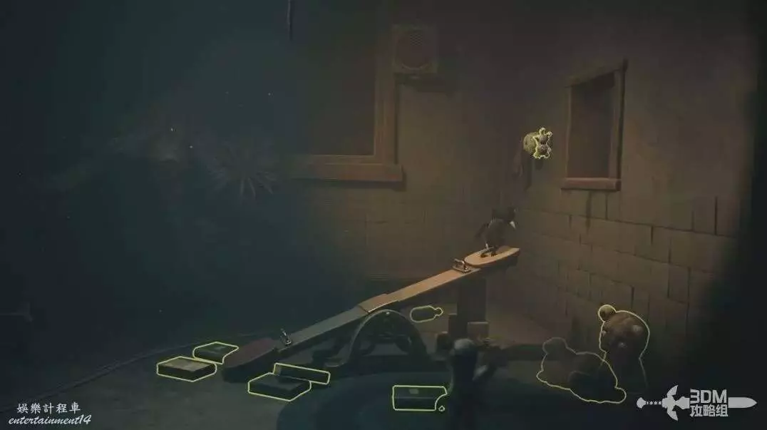拿著玩偶往右邊走,我們走到蹺蹺板上面,將人偶從視窗丟過去。