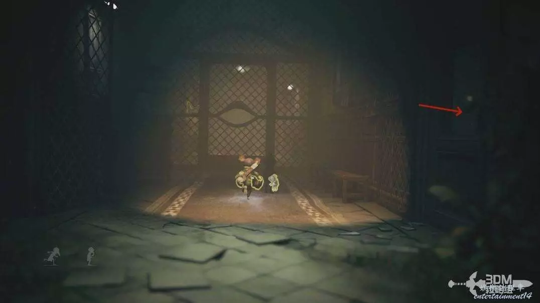 接下來往左邊走。這邊會有一個敵人在我們的必經之路上,我們蹲著走到箭頭處,然後用弓箭射擊右邊的酒瓶吸引他的注意力。