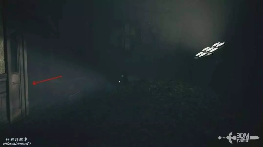 進來後射擊牆上的開關打開電燈,能看到地上有一個幽靈(6)。