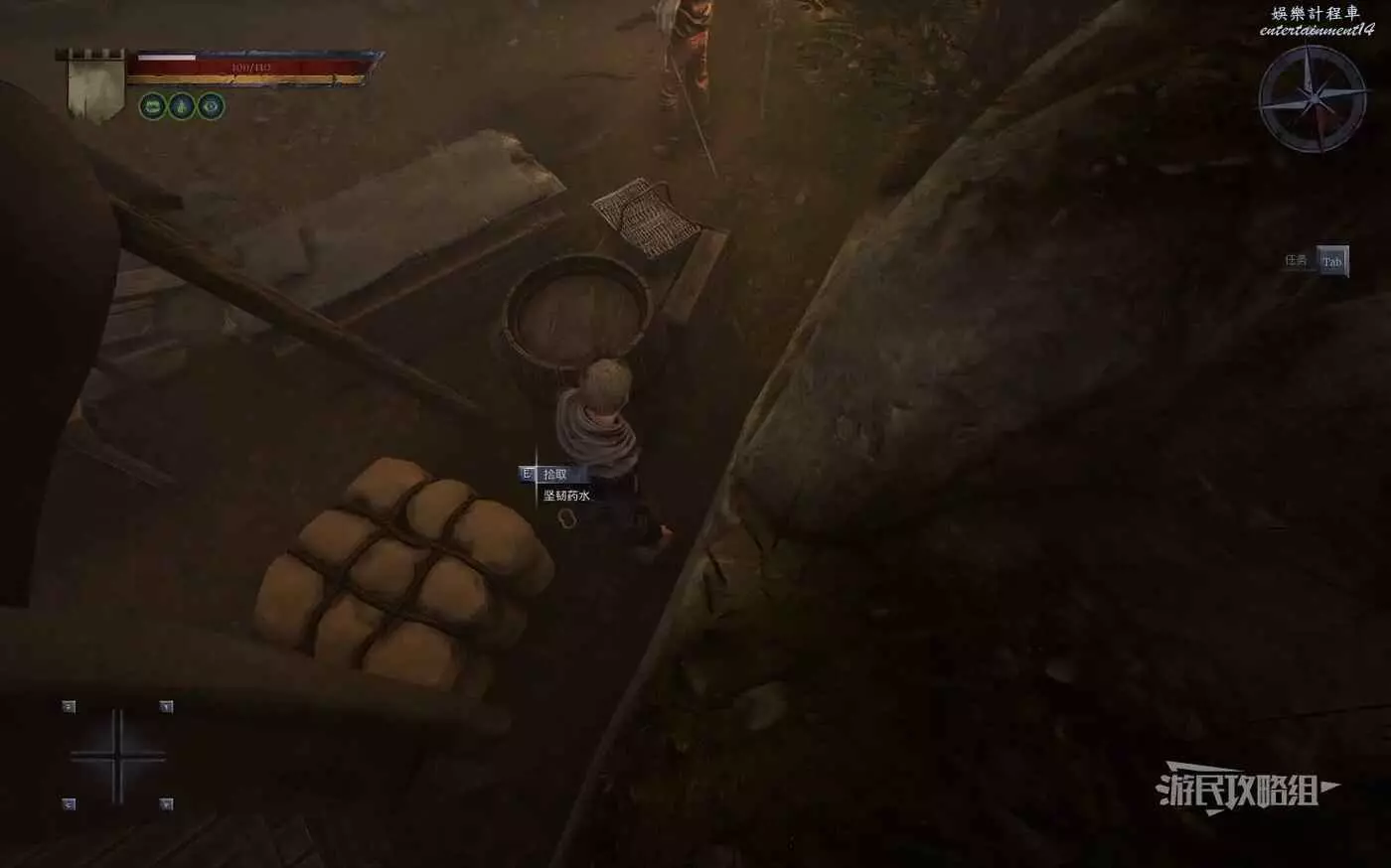 ①醫生埃米特左側木桶後方有一瓶堅韌藥水,建議留著先別喝,需要從帳篷右邊的床後方跳上山崖再跳到桶旁邊。【堅韌+1】