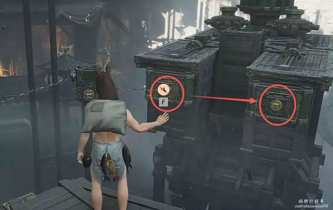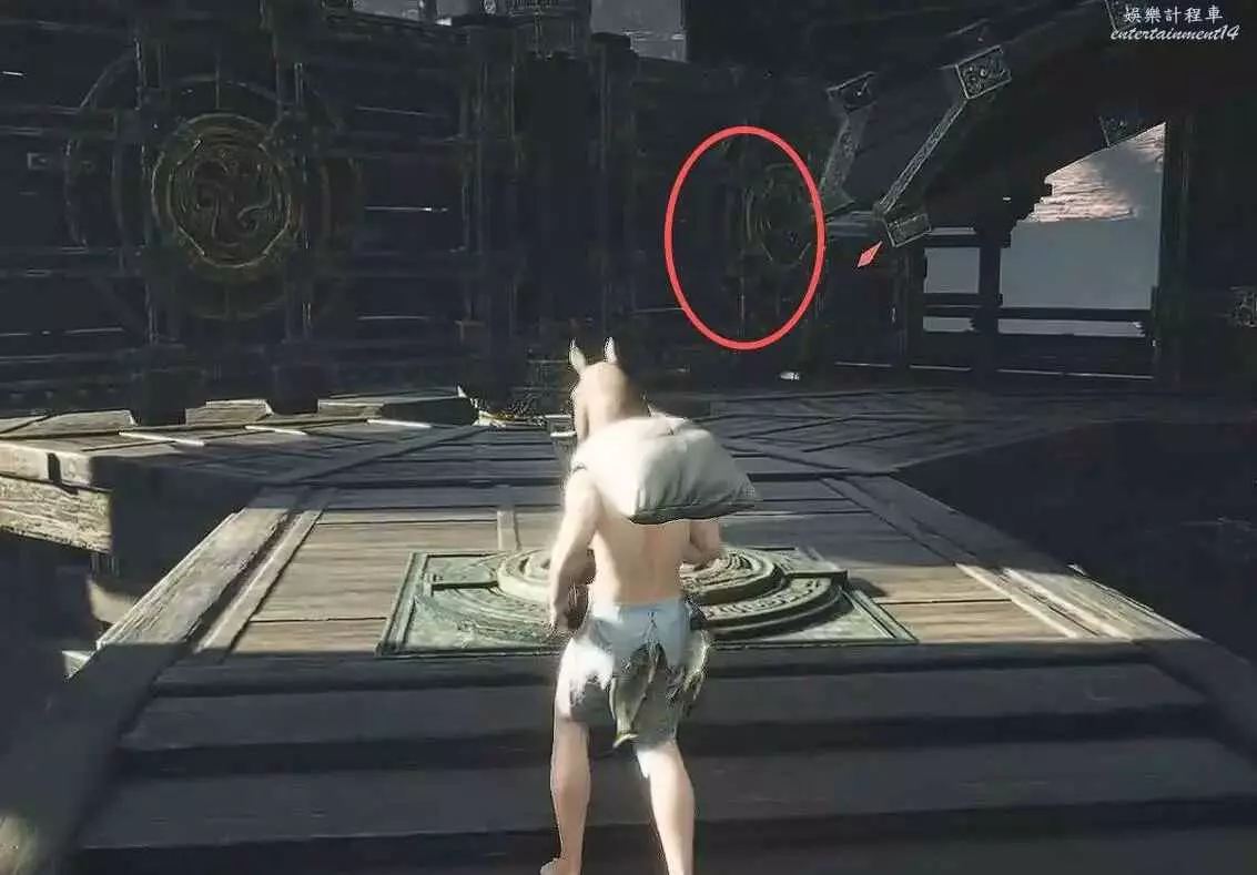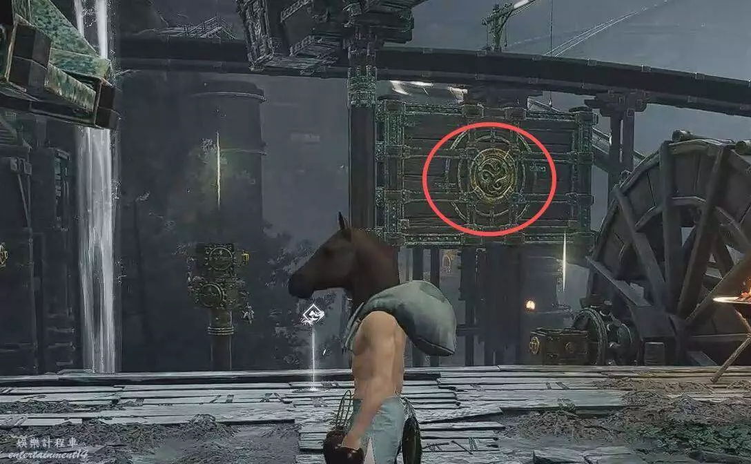 第二個解謎,站在【發光地板機關】上,使用【太極】抓石頭扔右邊的【木板機關】,然後就會來到水車前。(小Tips:此時小退一下遊戲,水車就開始轉了,防止後續修復此bug,還是教一下後面怎麼處理)
