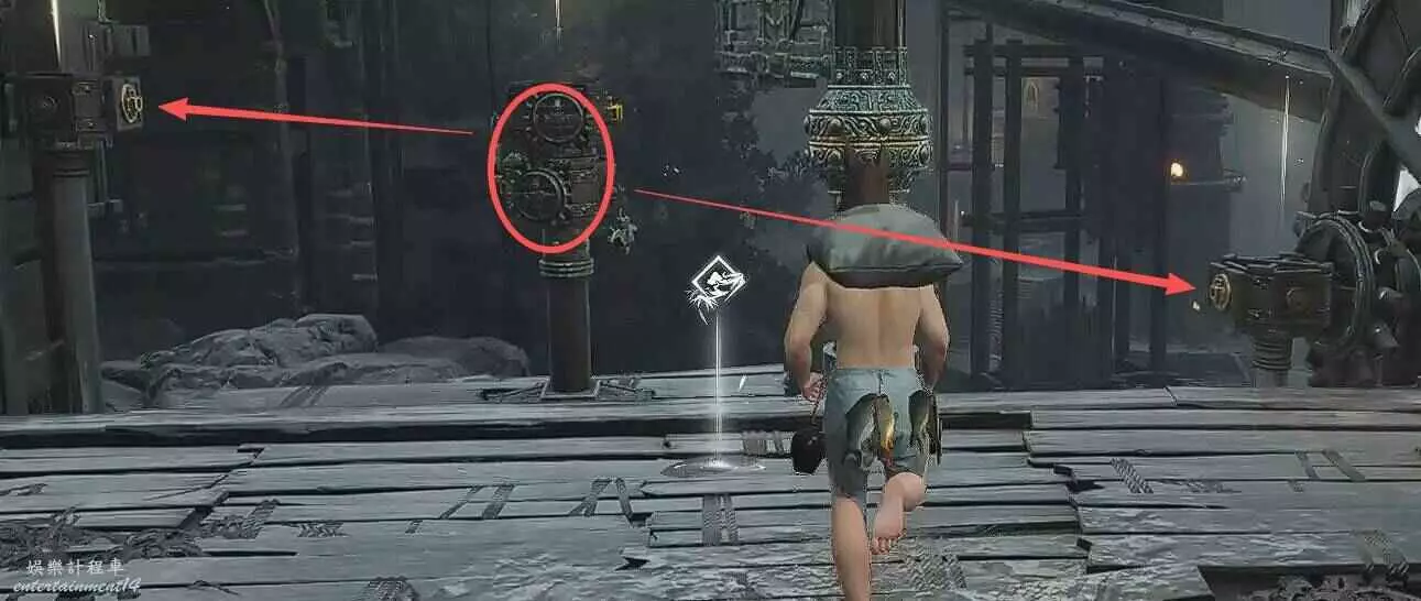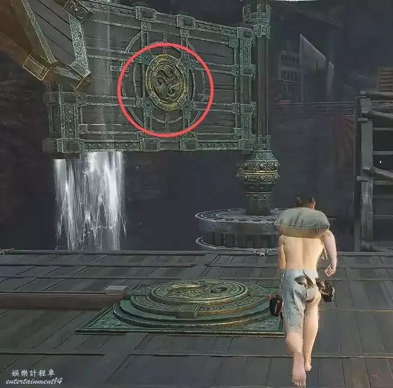 走水車右側的路繞回到剛剛的屋子,會發現另一個【發光地板機關】,然後使用【太極】把石頭扔到左側的【木板機關】上。回去處理水車的連結即可。