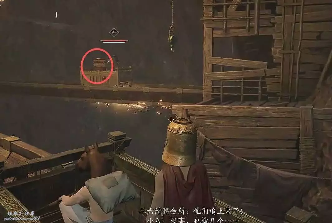 水車開始動了了之後,把下圖左側圓圈的繩索,放到右邊,然後就會有一個【可乘坐木板】過來;站到木板上,把剛剛的繩索放回去,就可以到對面了。