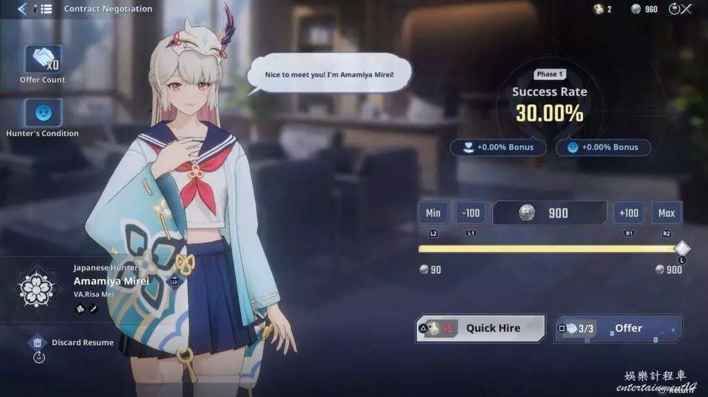 一旦您選擇了要招募的人,您將進入談判階段,您必須向該角色提供獵人硬幣以提高他們加入您小隊的幾率。每個獵人都有招募難度,這將決定需要多少獵人硬幣才能讓他們加入您的團隊。簡單難度招募僅需100硬幣,有45%幾率加入您的團隊;而困難難度招募需要900硬幣,只有30%幾率。您只有三次機會招募一個角色,之後談判將失敗,您必須稍後再試。