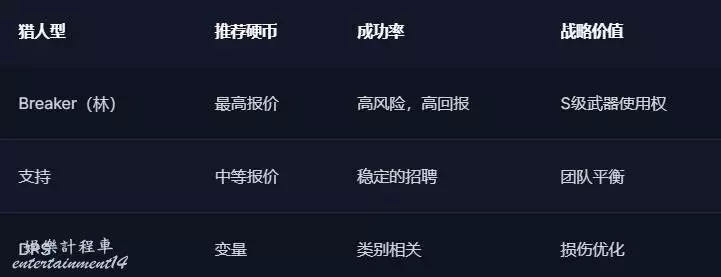 警告:失敗的報價會永久減少你的金幣池——謹慎預算,優先選擇與你職業選擇相匹配的獵人。