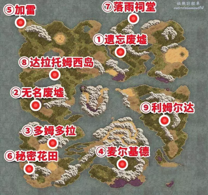 加雷、秘密花田、落雨祠堂、達拉托姆西之島、利姆爾達