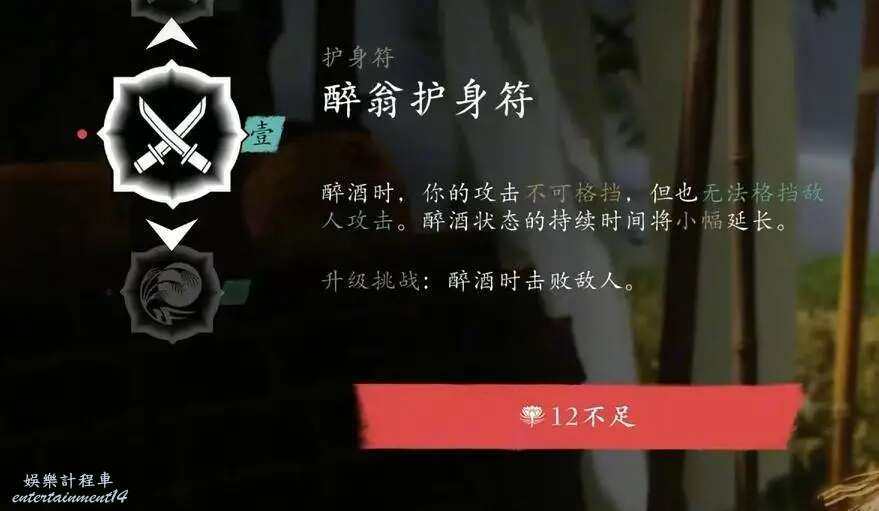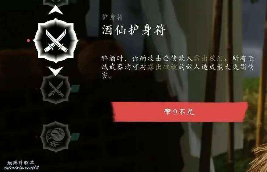 醉酒時,你的攻擊不可格擋,但也無法格擋敵人攻擊。醉酒狀態的持續時間將小幅延長。