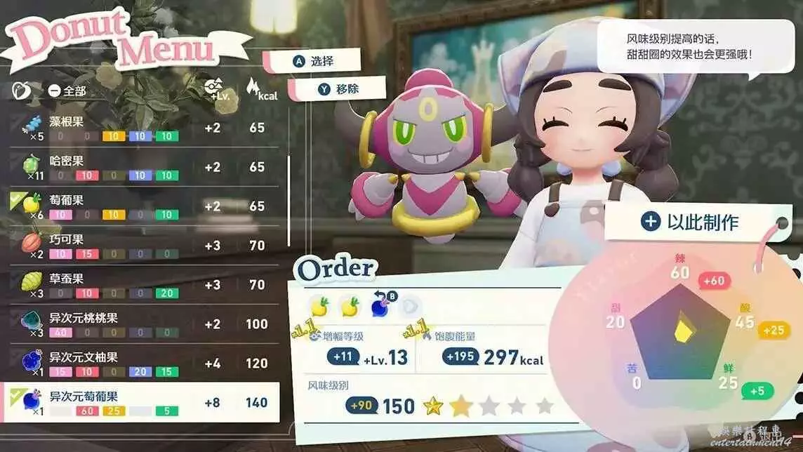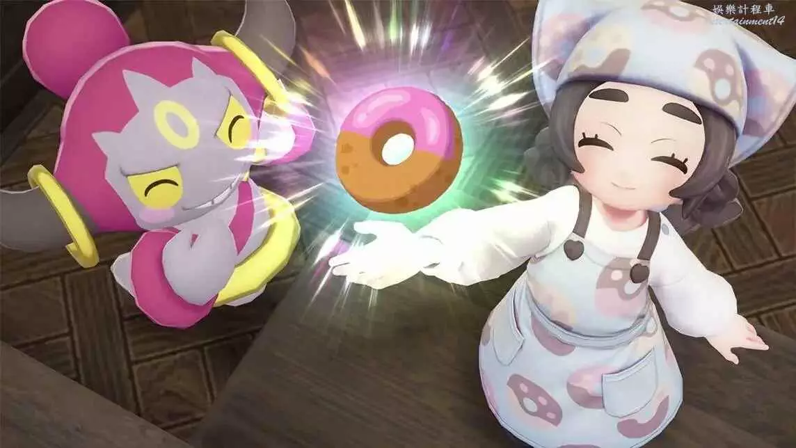 另外,帶著胡帕的神秘少女安馨兒很擅長做甜甜圈。只要給她樹果,她就能做出各種各樣的甜甜圈。給胡帕的甜甜圈會根據製作時使用的樹果產生各種各樣的效果,包括提升夥伴寶可夢的威力等等。