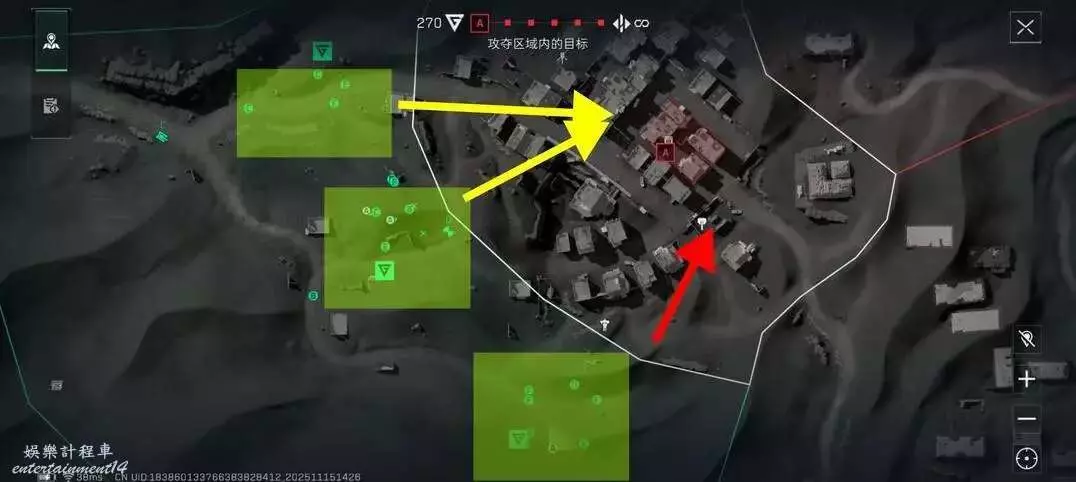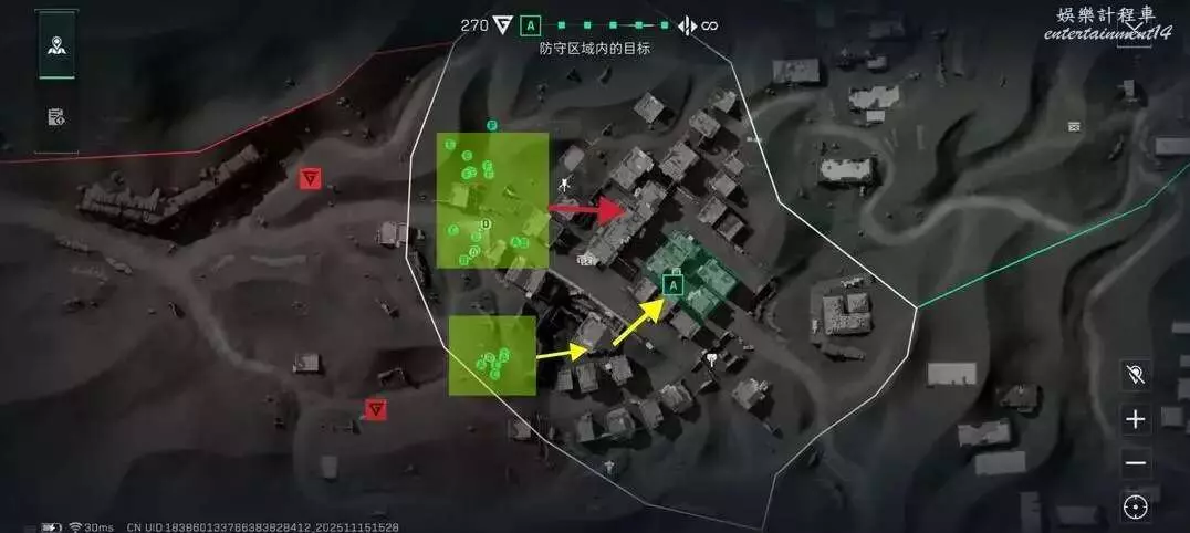 防守方與進攻方開局可以說是臉對臉見面就打的一個局面,只要防守方的槍線不密集很容易被攻防衝破。那麼兩個復活點的人可以利用開局的地形優勢沿著黃色和紅色剪頭進入建築內,通過進行高打底進行壓倒性的火力輸出在搭配上工程兵的ADS和支援的彈藥箱可以進行幾乎性質的輸出。同時在A點也必須有人佔領周圍的房子以防對面打側面進行速點。