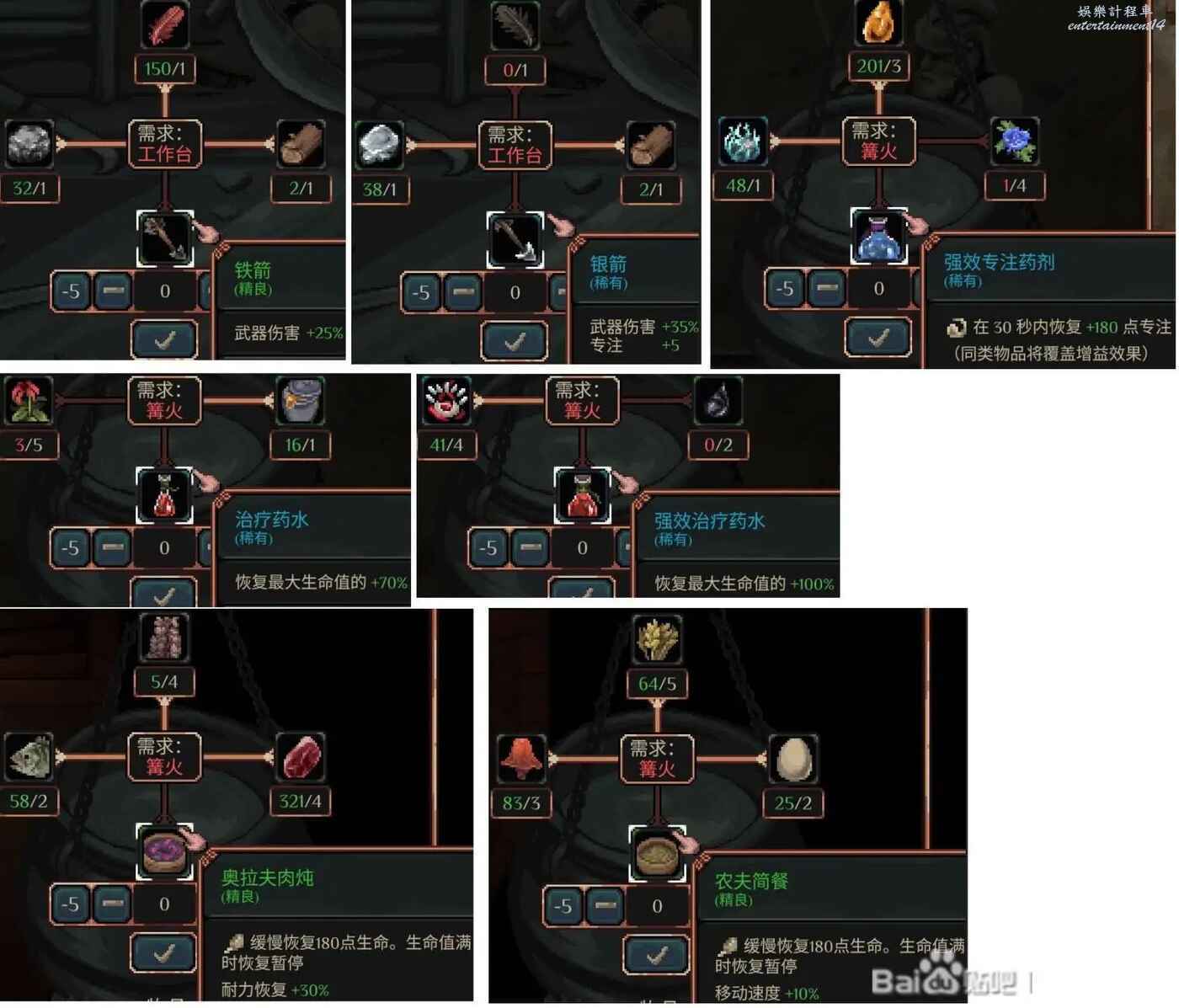 1.箭矢類:注意木頭、鷹身女妖羽毛的取得,木箭全靠撿,鐵礦銀礦等挖礦LV5之後再挖,有幾個地方賣的木材隨著章節推進會補充