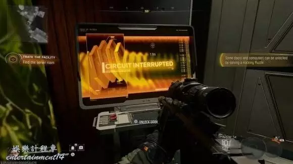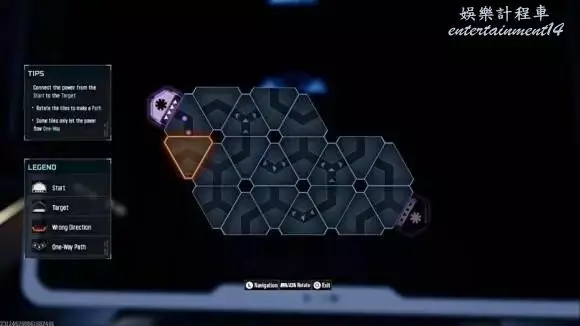 終端破解:在底層一個帶有玉米地投影的房間後方,找到終端機,開啟hacking小遊戲。玩法很簡單:使用L1/R1(或LB/RB)旋轉路徑節點,使電流從起點連通至終點。第一個謎題只需旋轉頂部和底部的節點即可完成。門解鎖後即可通過。