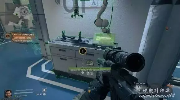 雙重破解:前方的量子電腦被鎖定,需要從左右兩側平台爬至上層陽台。兩邊房間各有一個終端,需完成與之前相同但稍複雜的hacking小遊戲。完成後返回量子電腦,奪取量子驅動器。