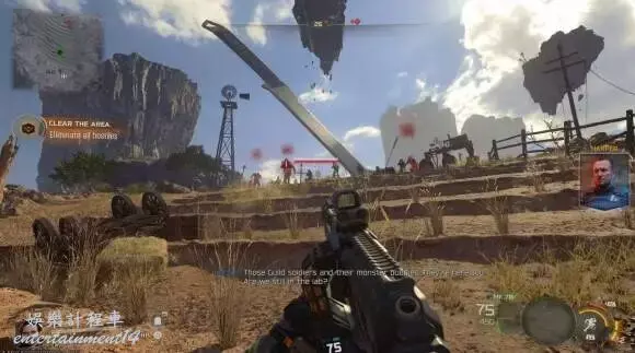 遭遇敵人與D.A.W.G機器人:穿過前方的通道,會看到一些公會士兵被直升機投下巡邏。你需要殺出一條血路。敵人中包括一種名為 D.A.W.G. 的四足機器人,它的攻擊力不俗,出現時需要小心應對。