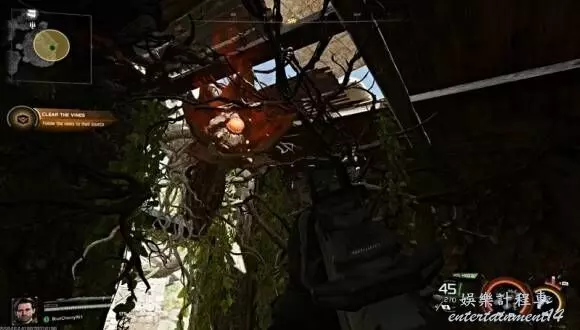 追蹤左側藤蔓:隊伍建議跟隨藤蔓找到並摧毀其源頭。首先追蹤向左後方建築延伸的藤蔓。會有公會敵人出現守衛建築,先清除他們。清理完畢後,跟隨藤蔓穿過建築(裡面有一個自救套件)。在建築後方,使用抓鉤擺蕩到上方的區域。