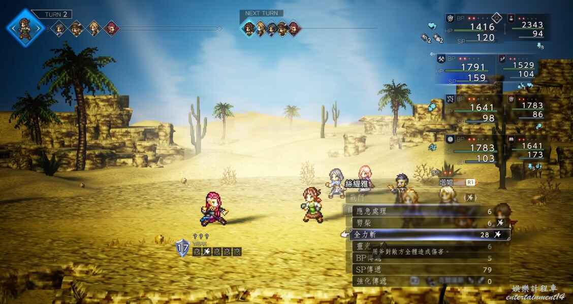 配合每回合 8 人都會 +1 的 BP(增幅點數)系統,讓其整個組隊和戰鬥策略有了更明確的變化,《歧路旅人》系列講究的就是以 BP 系統搭配弱點來破盾並攻擊的機制,而 8 人可以更好的覆蓋所有的武器和屬性,來選擇最快破盾的戰略安排。
