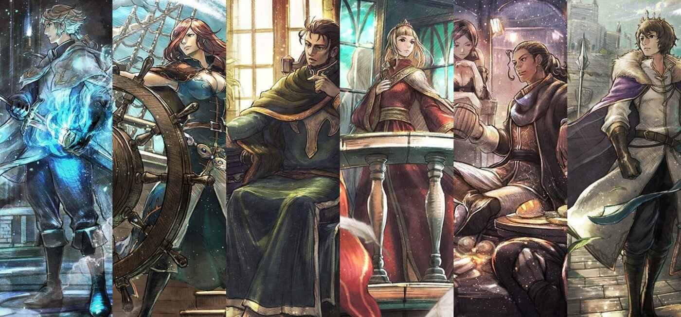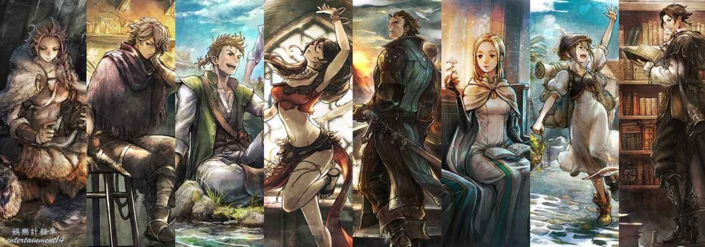 下圖從左至右依次為獵人海因特、盜賊泰裡翁、藥師亞芬、舞娘普利姆羅潔、劍士歐爾貝克、神官歐菲利亞、商人特蕾莎、學者賽拉斯。