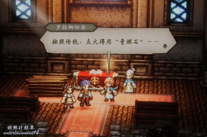 接過羅拉娜的委託之後,我們便進入了出教堂的動畫,村民提醒我們在有青燃石的洞裡,有著一位學者