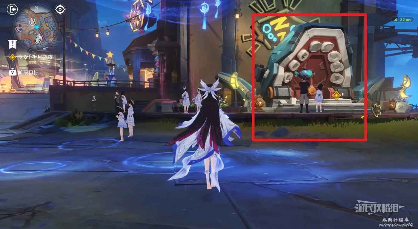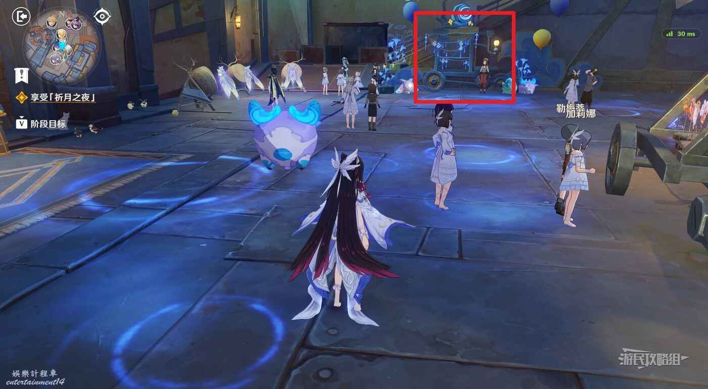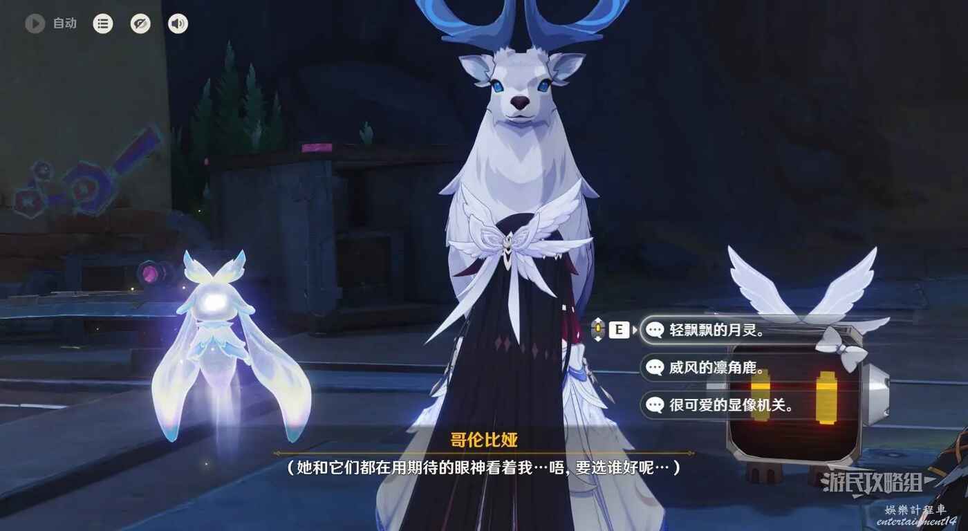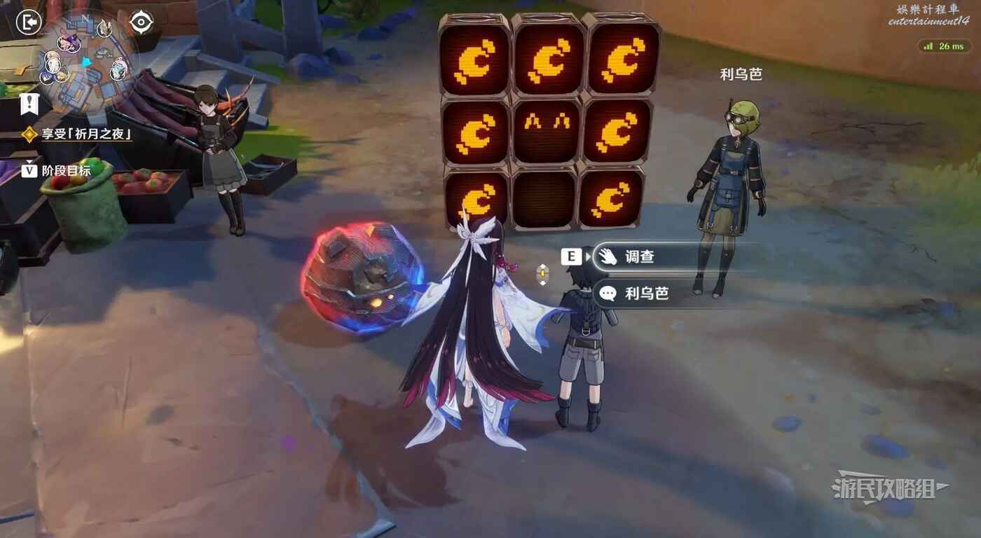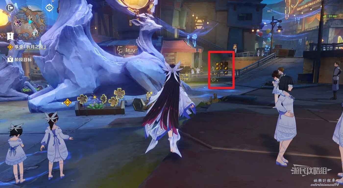 在廣場中間巨大的鹿旁邊可以看到9個顯像機關,與旁邊的利烏芭對話。開始挑戰後,等眼睛圖示移動到糖果的位置點擊【就是現在】即可完成小遊戲,總共有三輪,全部完成後可以獲得摩拉獎勵。