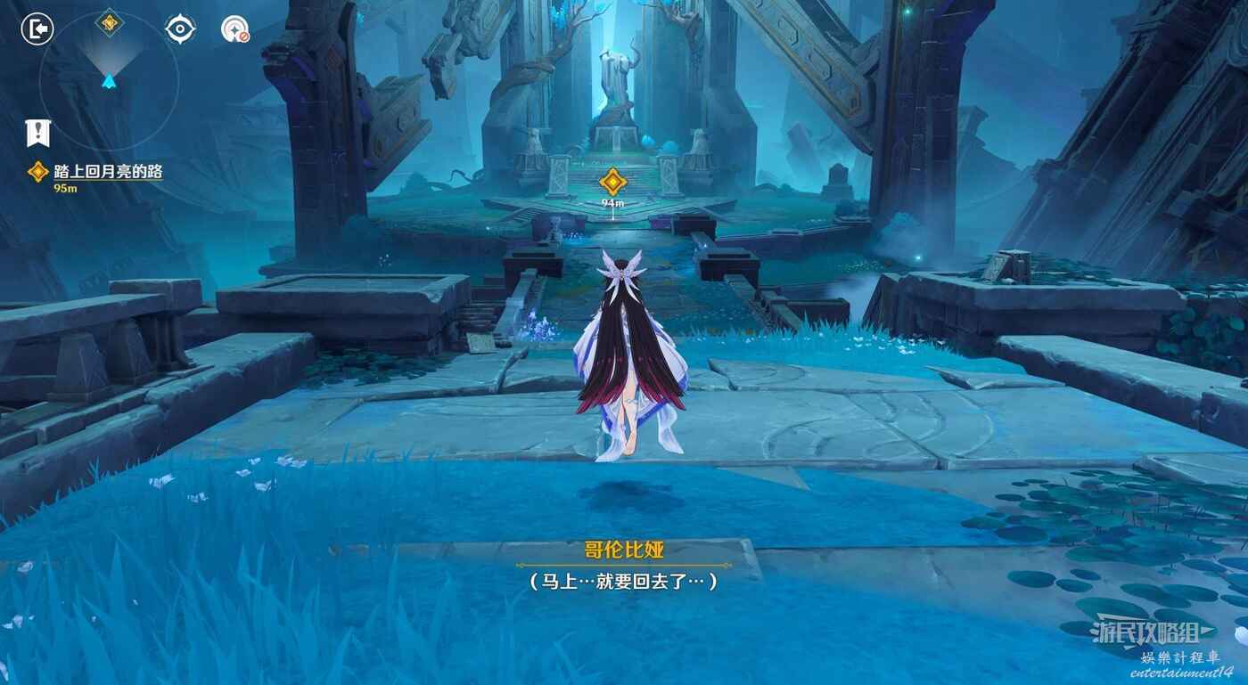 穿過大門繼續往前走(這裡藍球不需要帶),走到前方斷裂的樓梯處,前方有多段需要變成月靈前進的光路,期間還需要切換多次光路,但路線只有一條,只需要沿著光路到達對岸目標位置即可。注意期間光路上會出現許多擋路的石門,及時與石門左側的機關互動可以提前打碎石門,來不及的話直接撞過去也問題不大。站在月亮草旁邊,變身月靈進入光路。