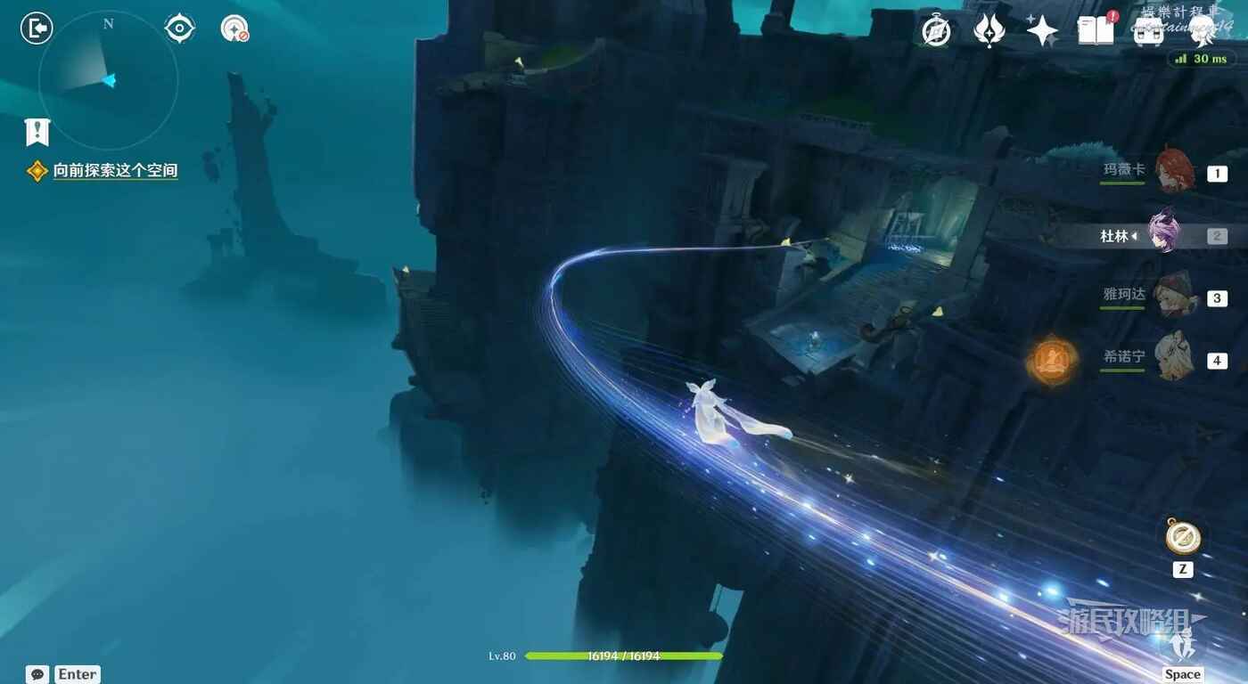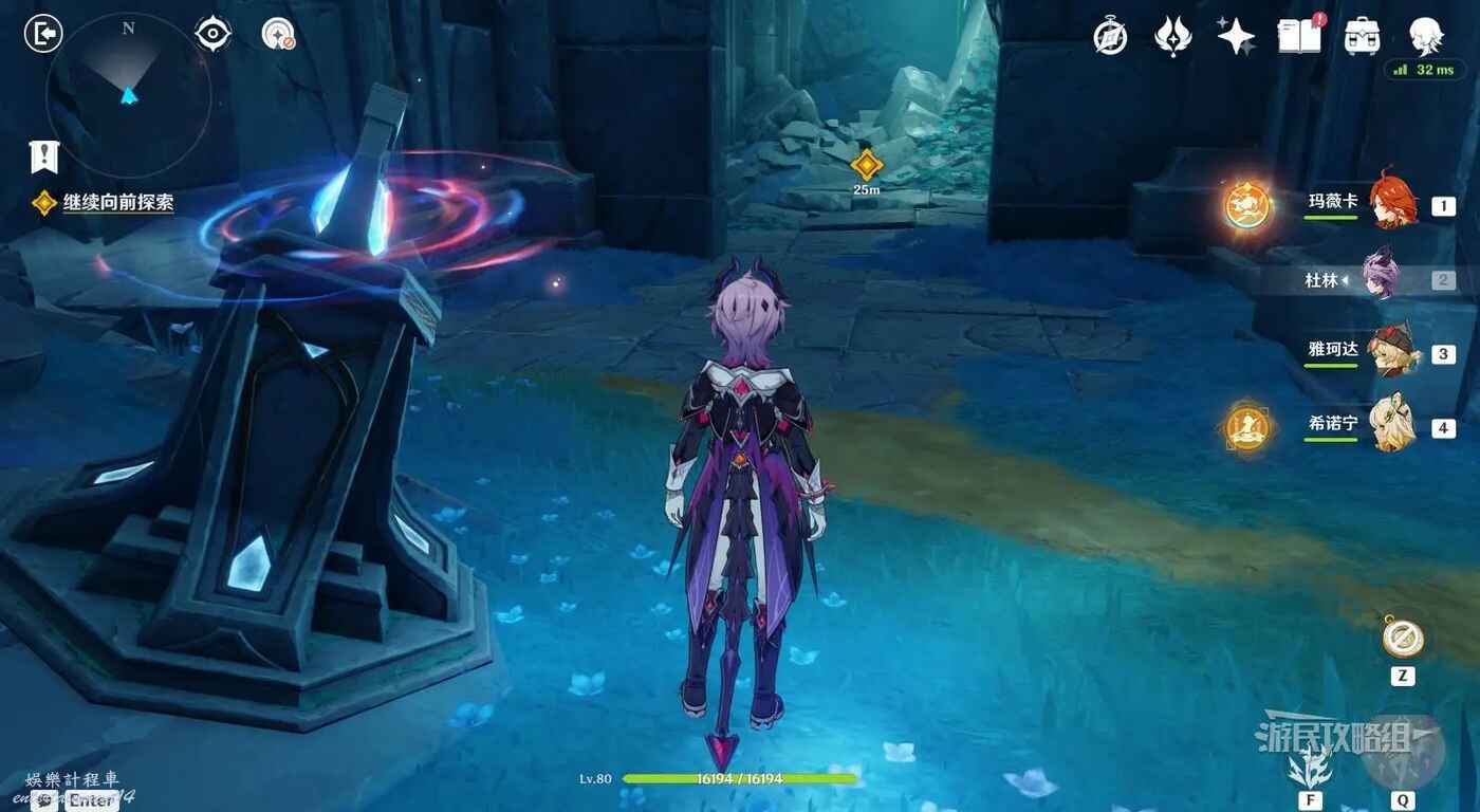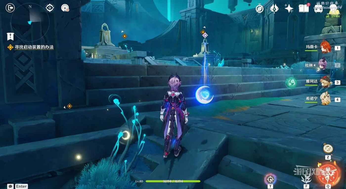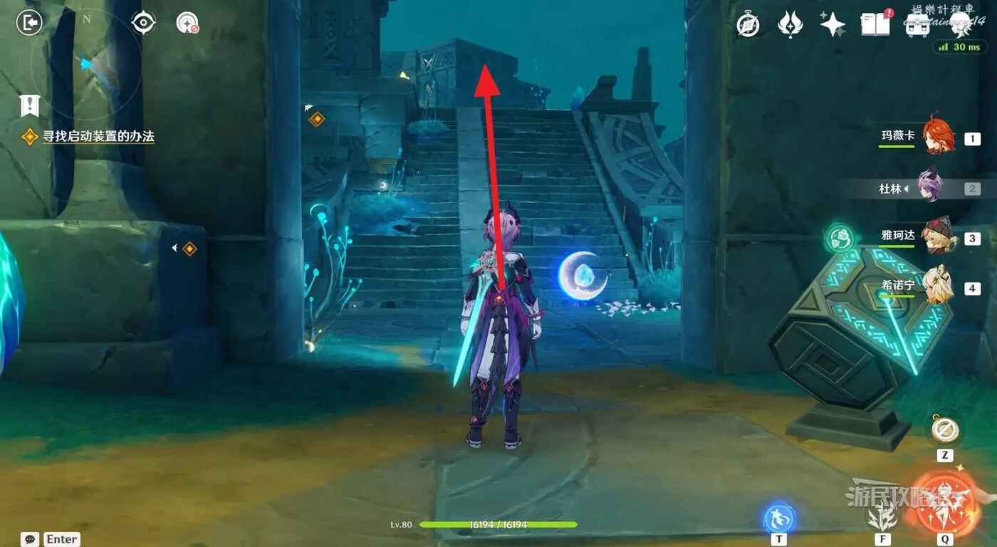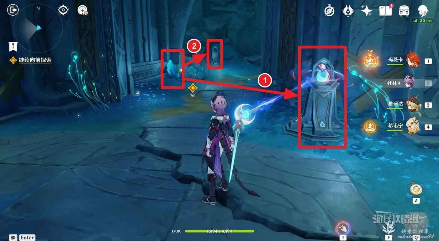 拾取藍球後,轉身,將藍球放在小地圖北方向的機關裡,打開前路。