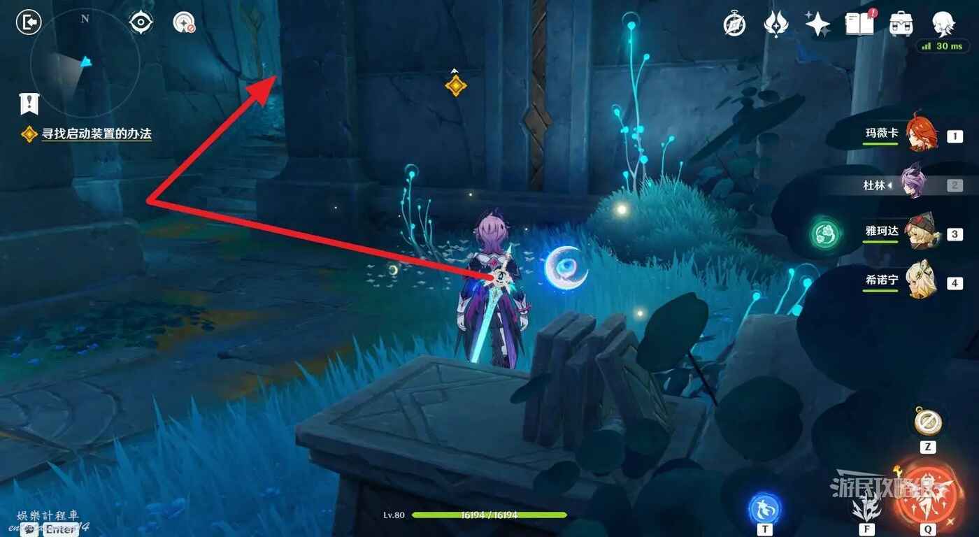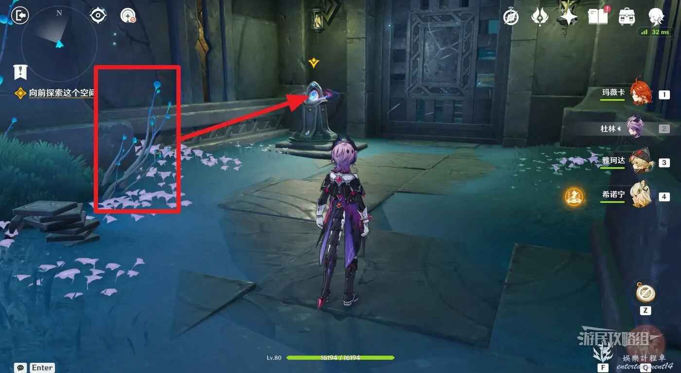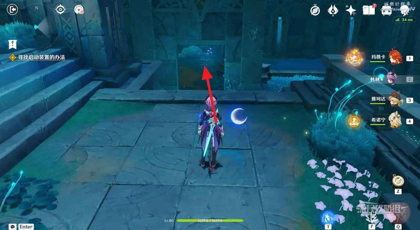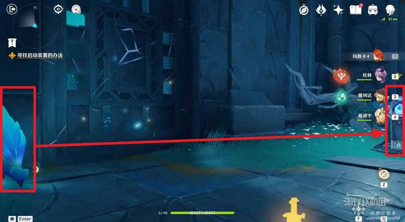 來到指引位置,站在左側牆邊月亮草的位置,與前方大門左側的藍球機關互動,即可打碎大門。