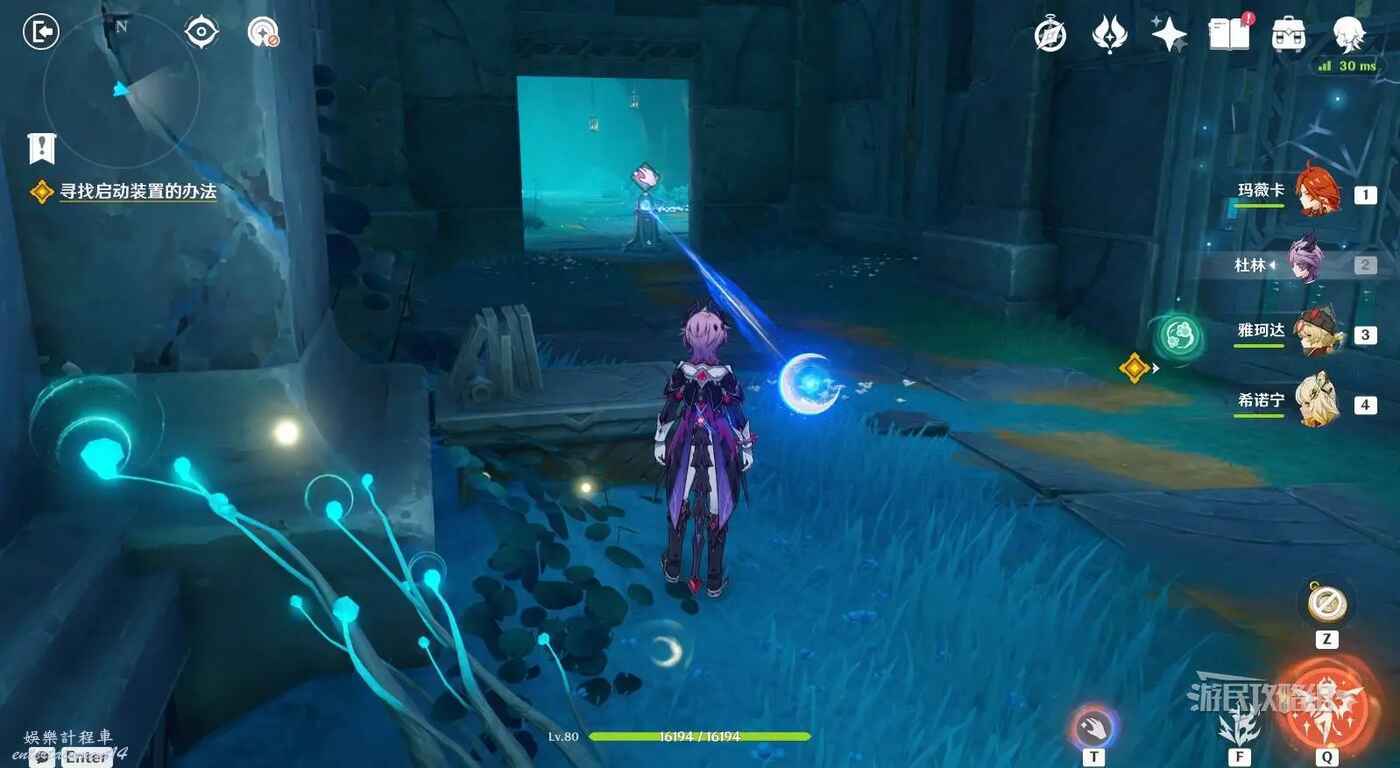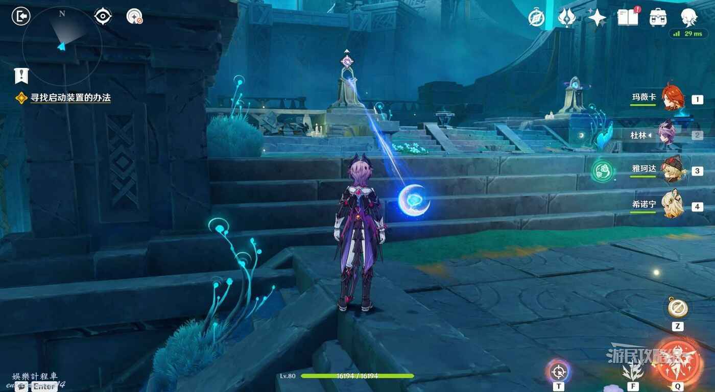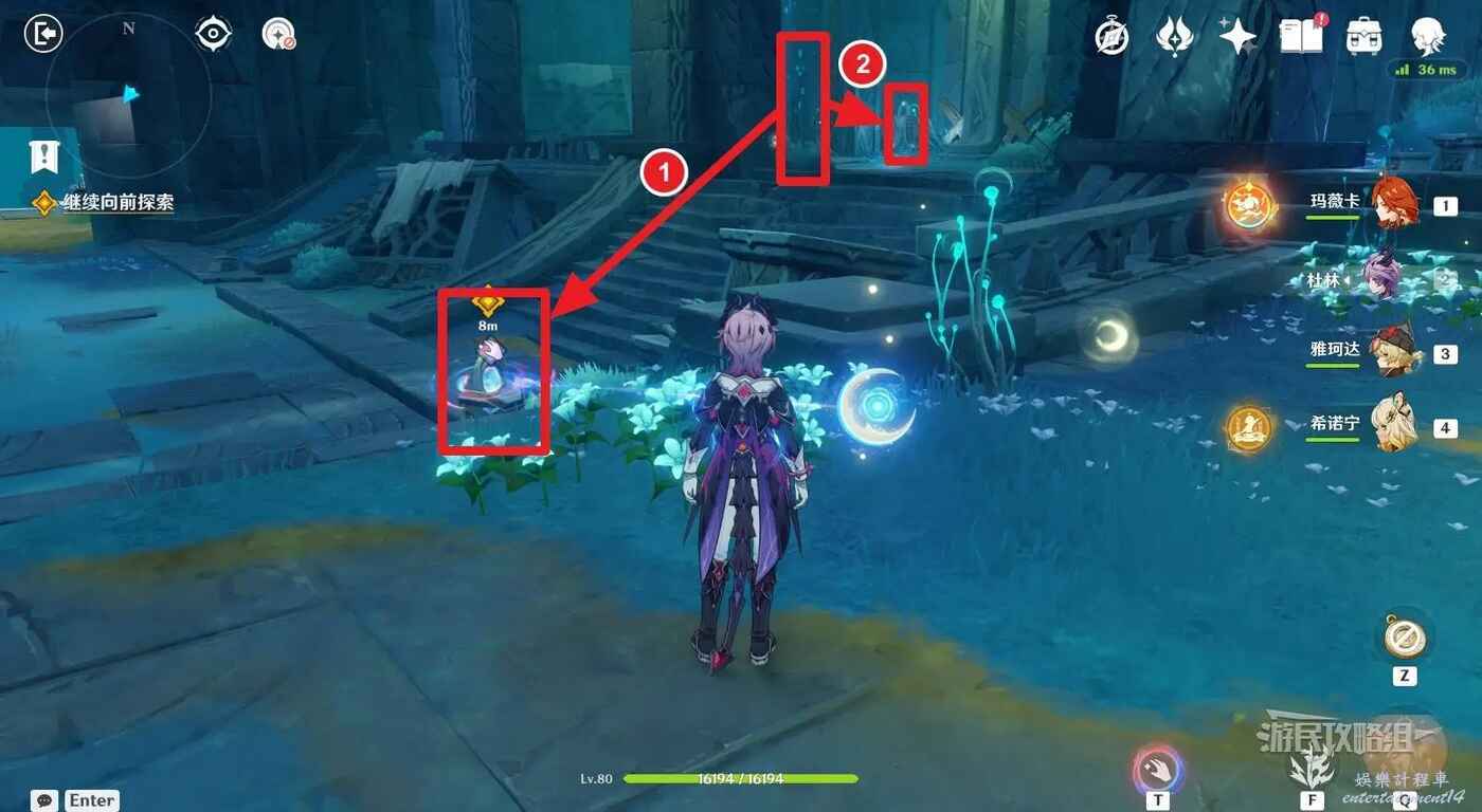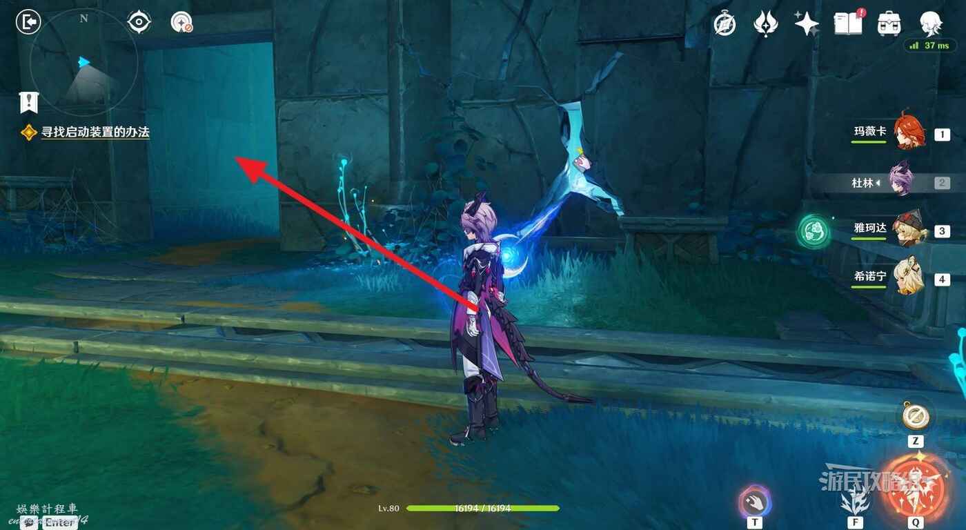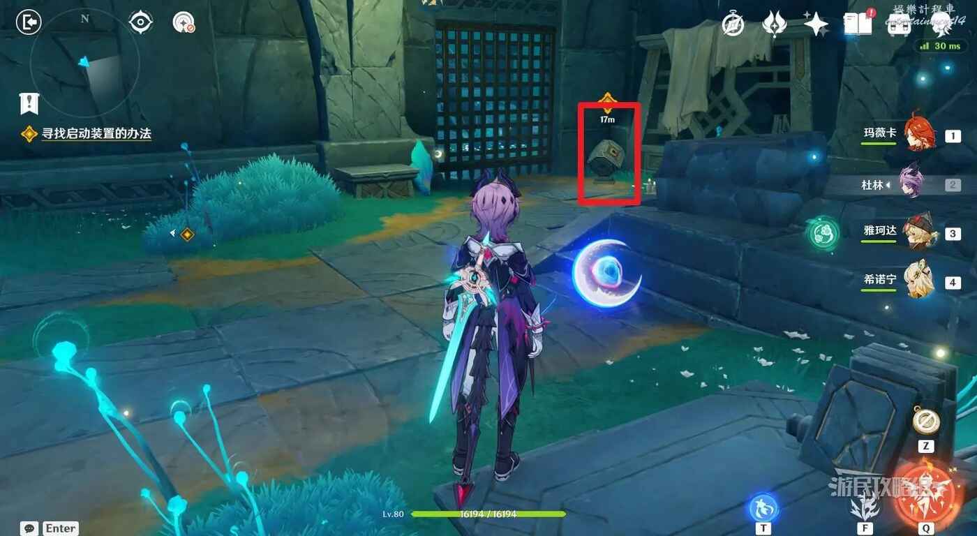 來到指引位置,站在左側牆邊月亮草的位置,與前方大門左側的藍球機關互動,即可打碎大門。