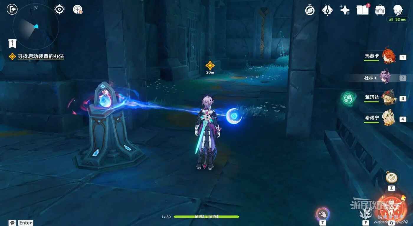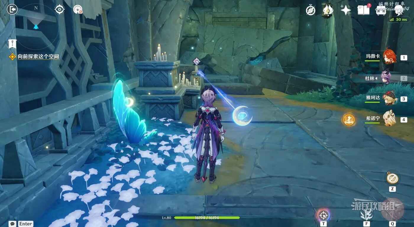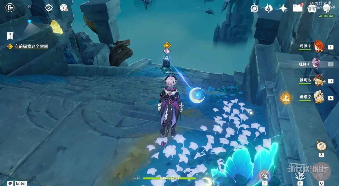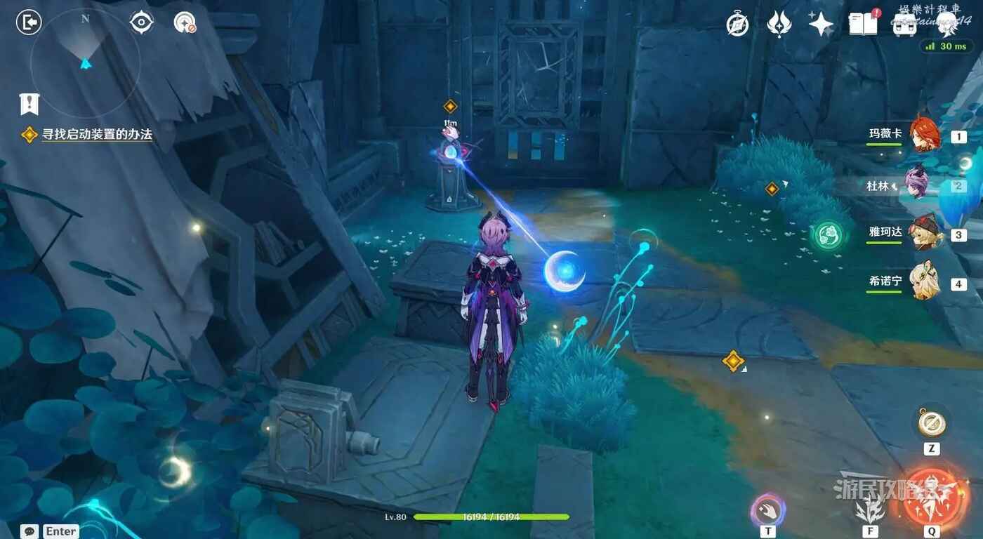 來到指引位置,站在左側牆邊月亮草的位置,與前方大門左側的藍球機關互動,即可打碎大門。