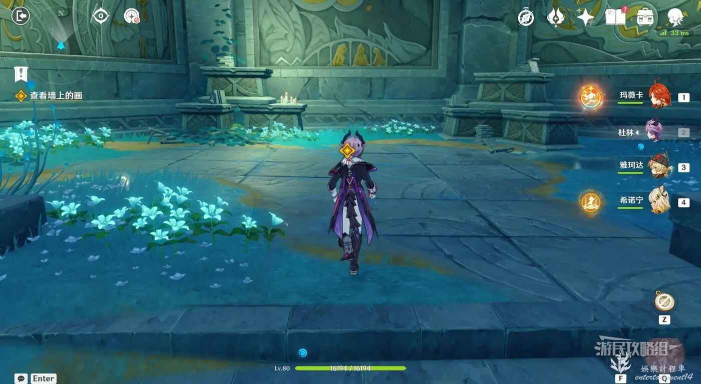 繼續沿路前往目標位置,前方需要與水史萊姆、水形幻靈、飄浮靈等敵人戰鬥。擊敗敵人後繼續前往任務目標位置查看壁畫,觸發劇情。