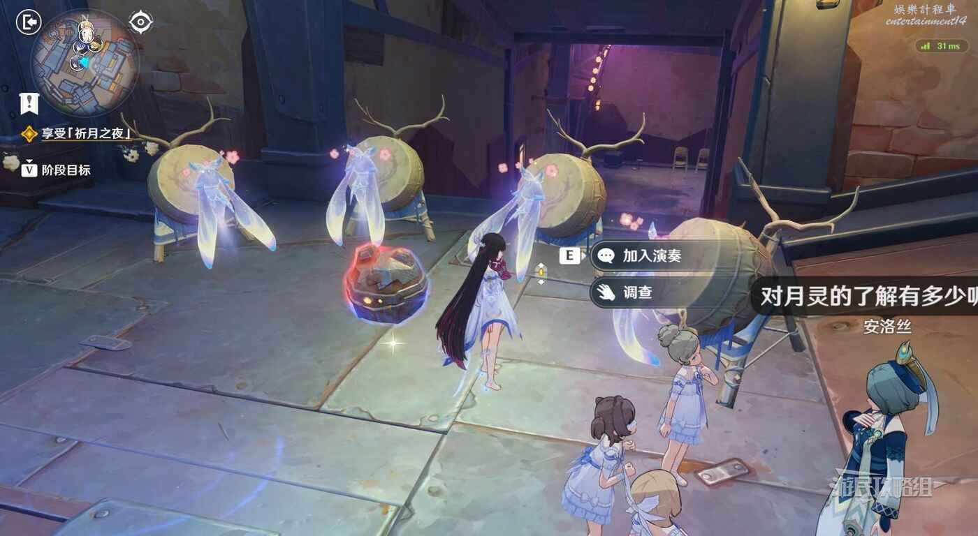在菲林斯和菈烏瑪頭像之間,通往旗艦的下行樓梯頂部,可以看到四隻月靈和四面鼓,靠近光點選擇【加入演奏】,等待前三隻月靈敲鼓後,點擊【就是現在】,即可完成此遊戲。
