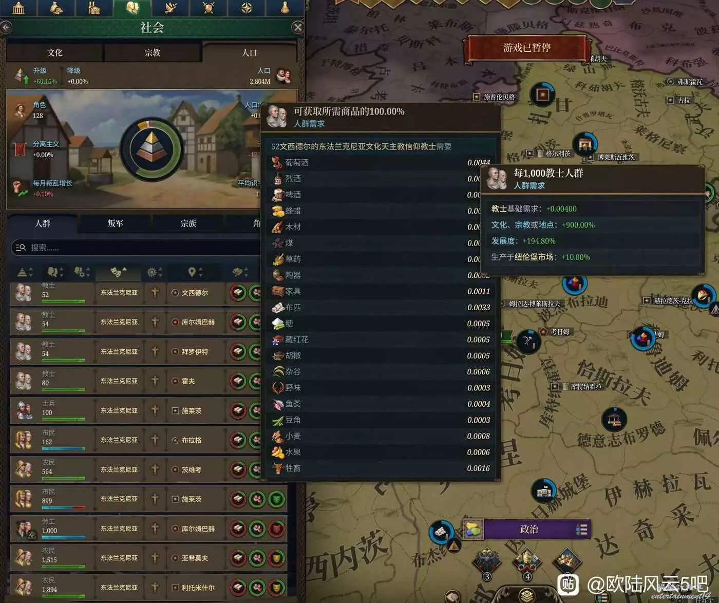 本市場內需求分為兩類,一是人群需求。看一個群體的需求可以來到社會-人口-人群放到中間的圈上看。需求受到階級種類(貴族需求比農民更高),文化宗教或地點修正,發展度和本地生產修正。最為核心的兩條就是階級種類和發展度。每1k農民基礎需求葡萄酒0.0004,而貴族是0.006,貴族是農民的15倍。根據觀察貴族,教士,市民是需求的上三旗,需求很大,農民和勞工則較低。