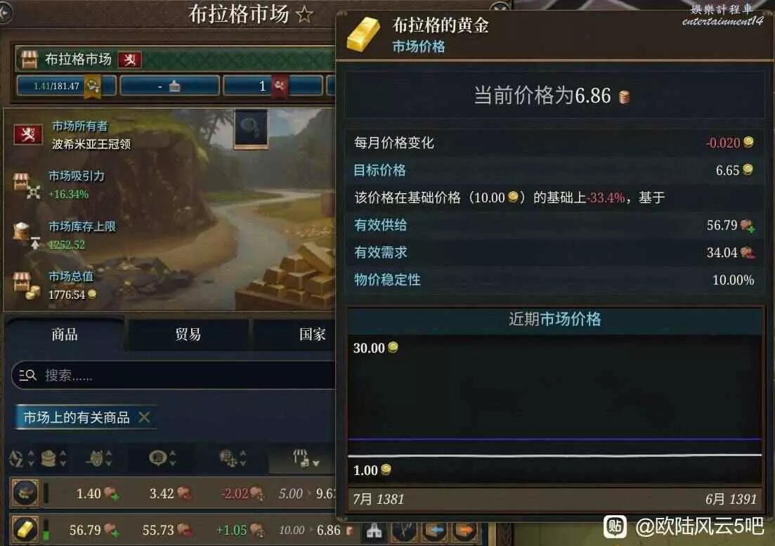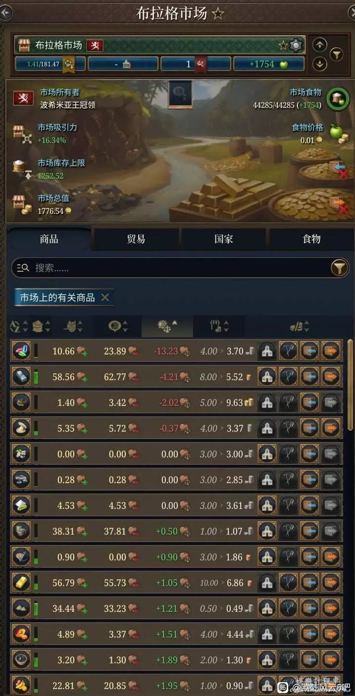 圖中是我1391年波西米亞布拉格市場的情況,可以看到出現了一個明顯的問題,就是基本所有商品的價格都低於標準價,這會導致鋪一產和二產時收入降低進而導致收益降低,解決這個問題才能突破生產過剩需求不足的經濟瓶頸。
