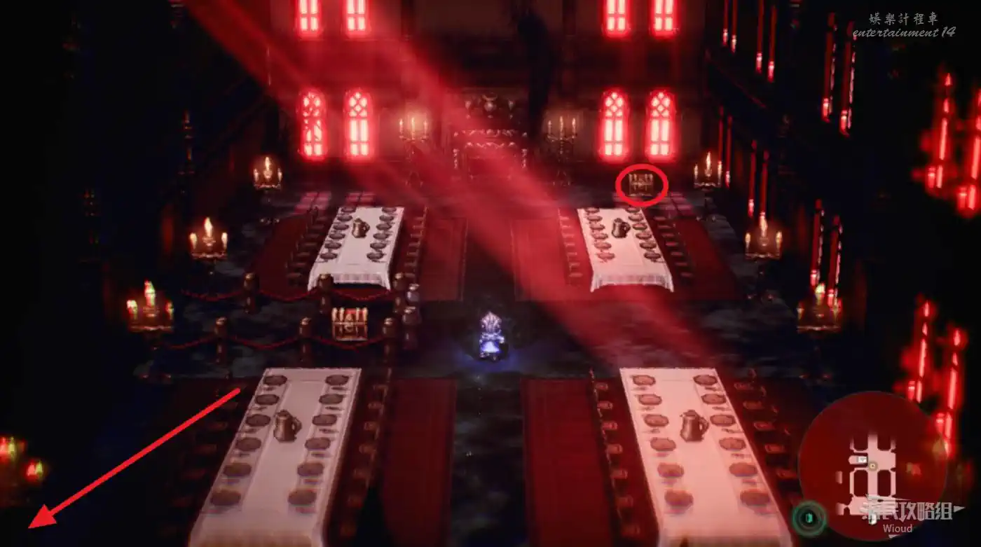 左下角先往上方入口走,通過右邊出口打開餐廳【寶箱2】。