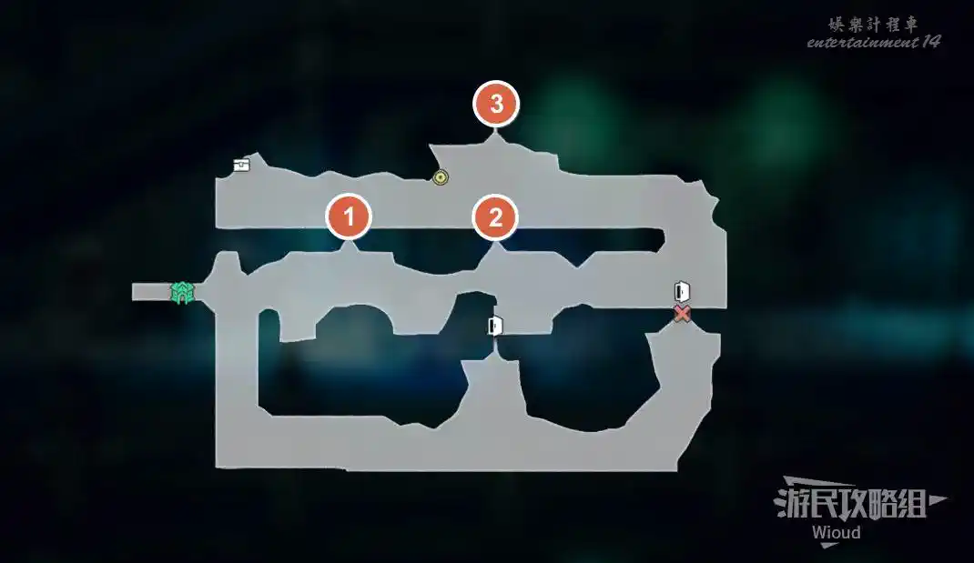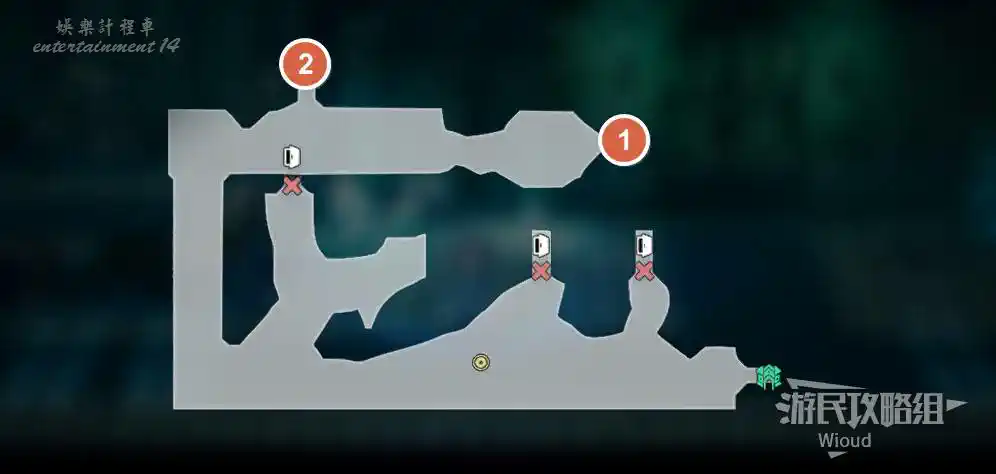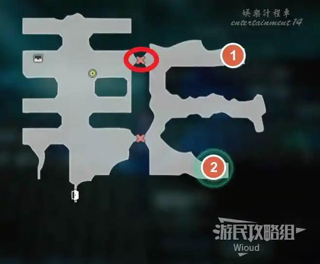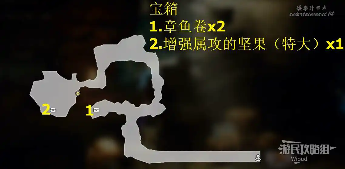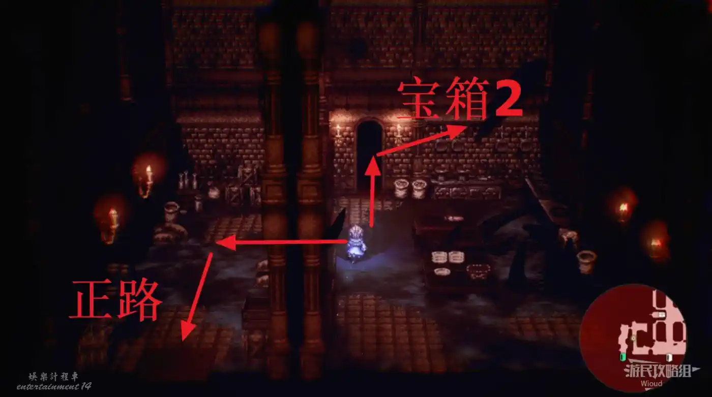 先進入房間①,找到【寶箱13】與【寶箱14】,在標注②開啟【寶箱15】。