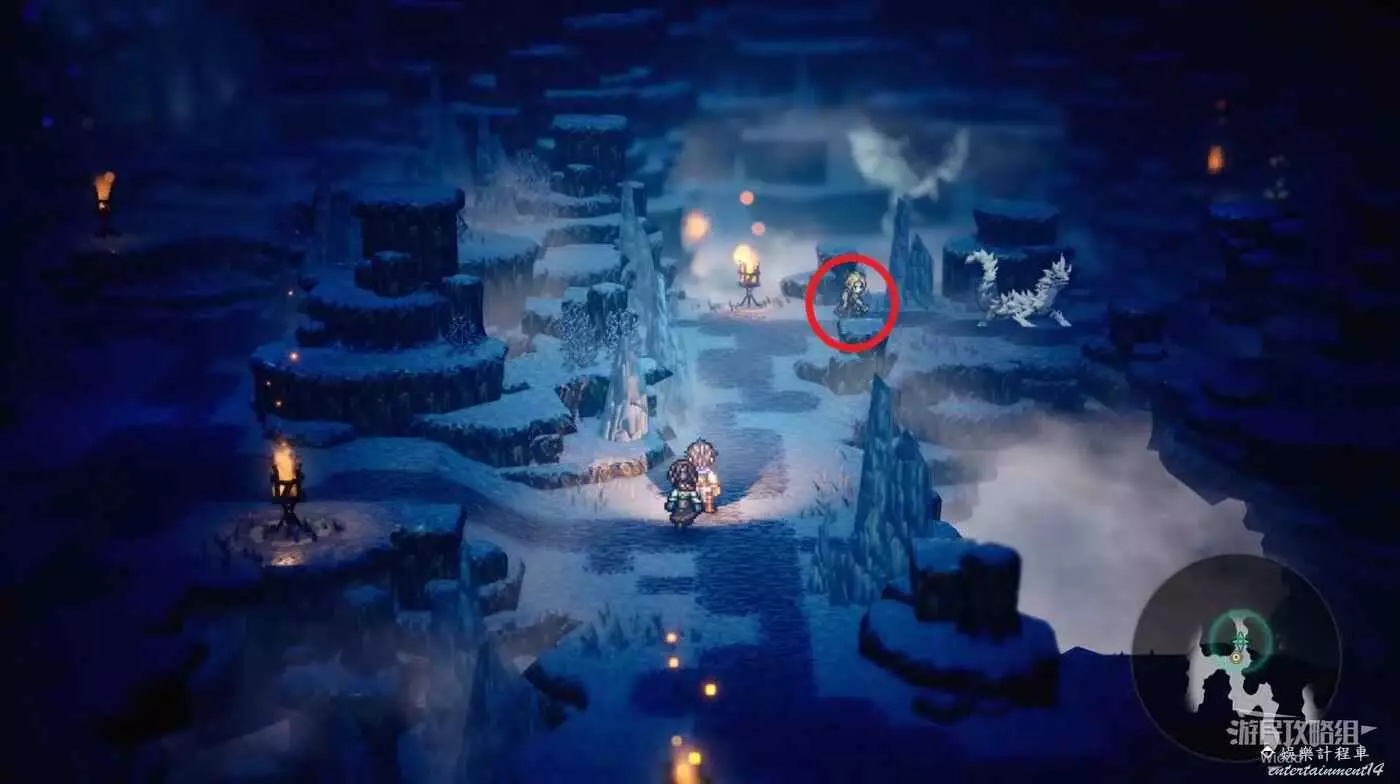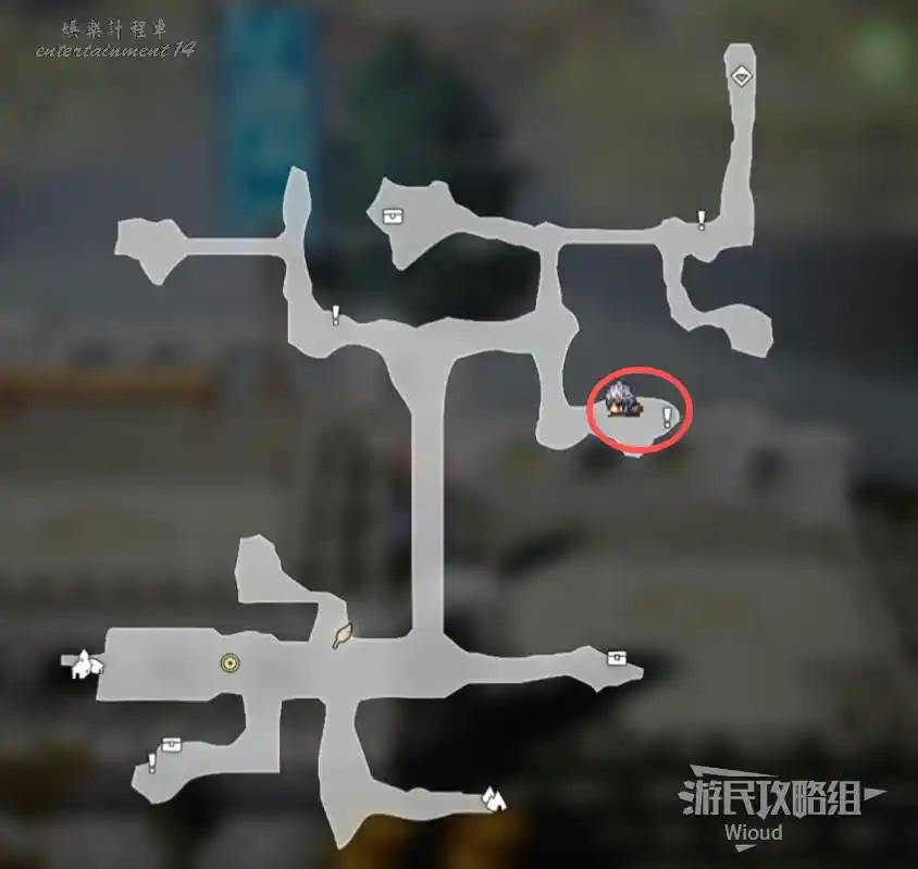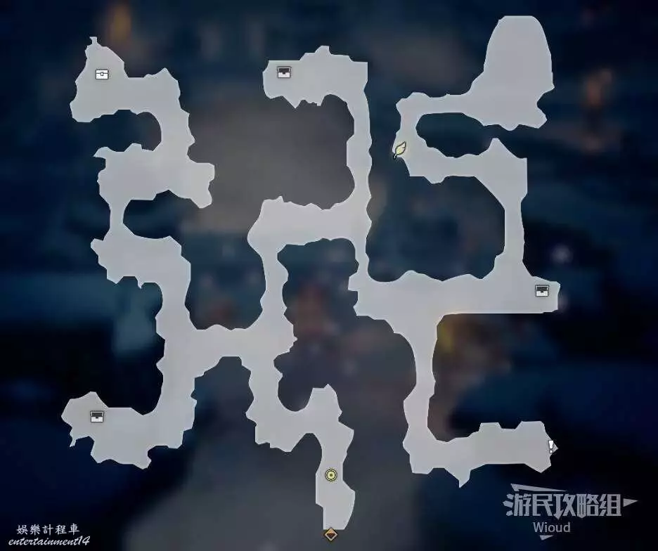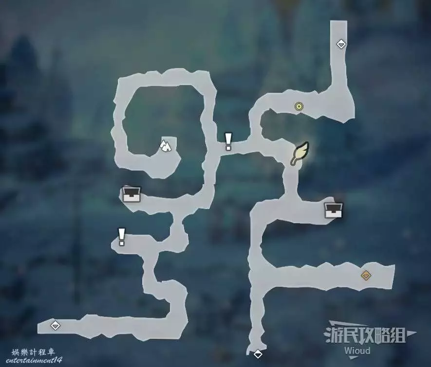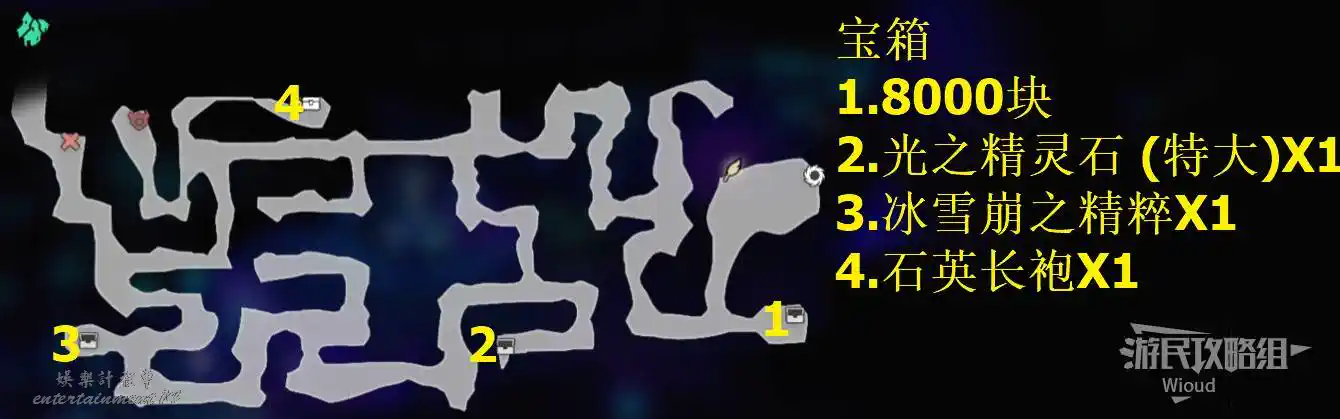 以下是【雪花晶洞穴】的寶箱位置,左上角的上鎖寶箱暫時無法打開,中上方的寶箱被強大的怪物守護,建議後續再過來。