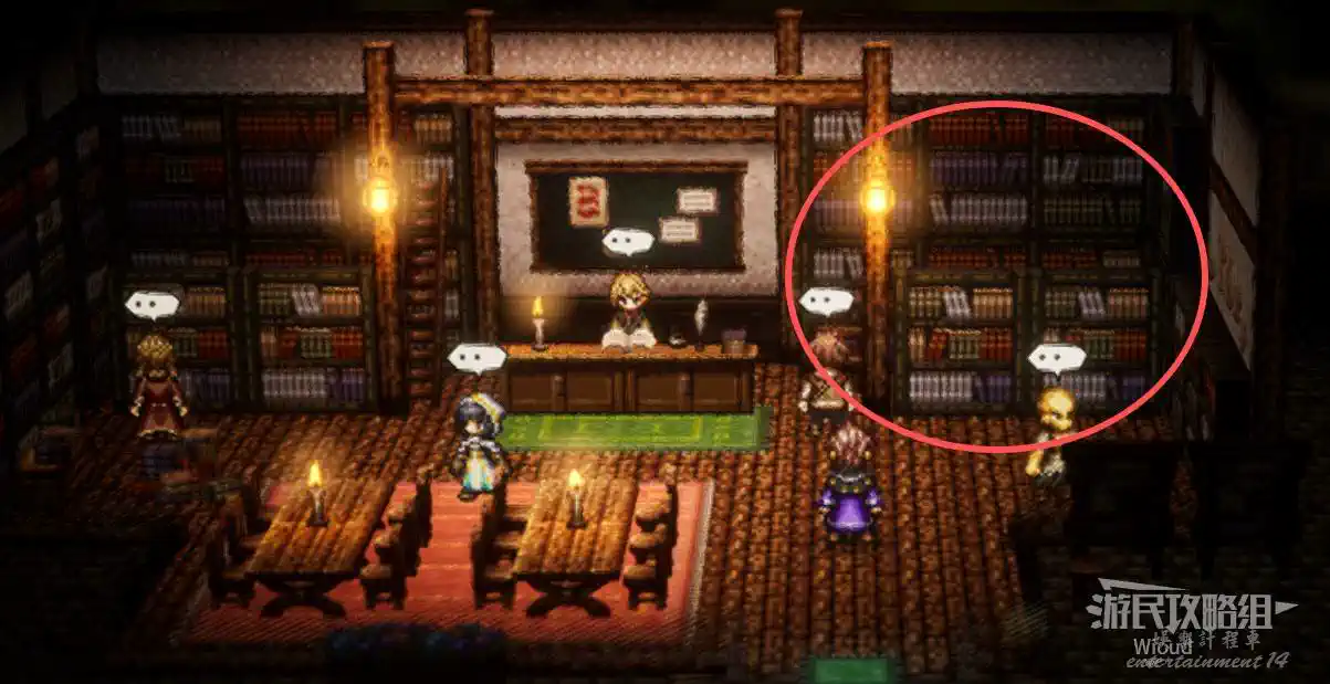 到達圖書館,在書架上拿到一個【書信碎片】,和左邊橙色對話方塊的【阿蕾可西雅】對話,打聽生平後索要【阿蕾可西雅魔術論考】。