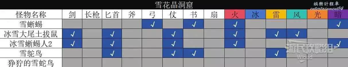 以下是【雪花晶洞穴】分佈的怪物弱點資訊。