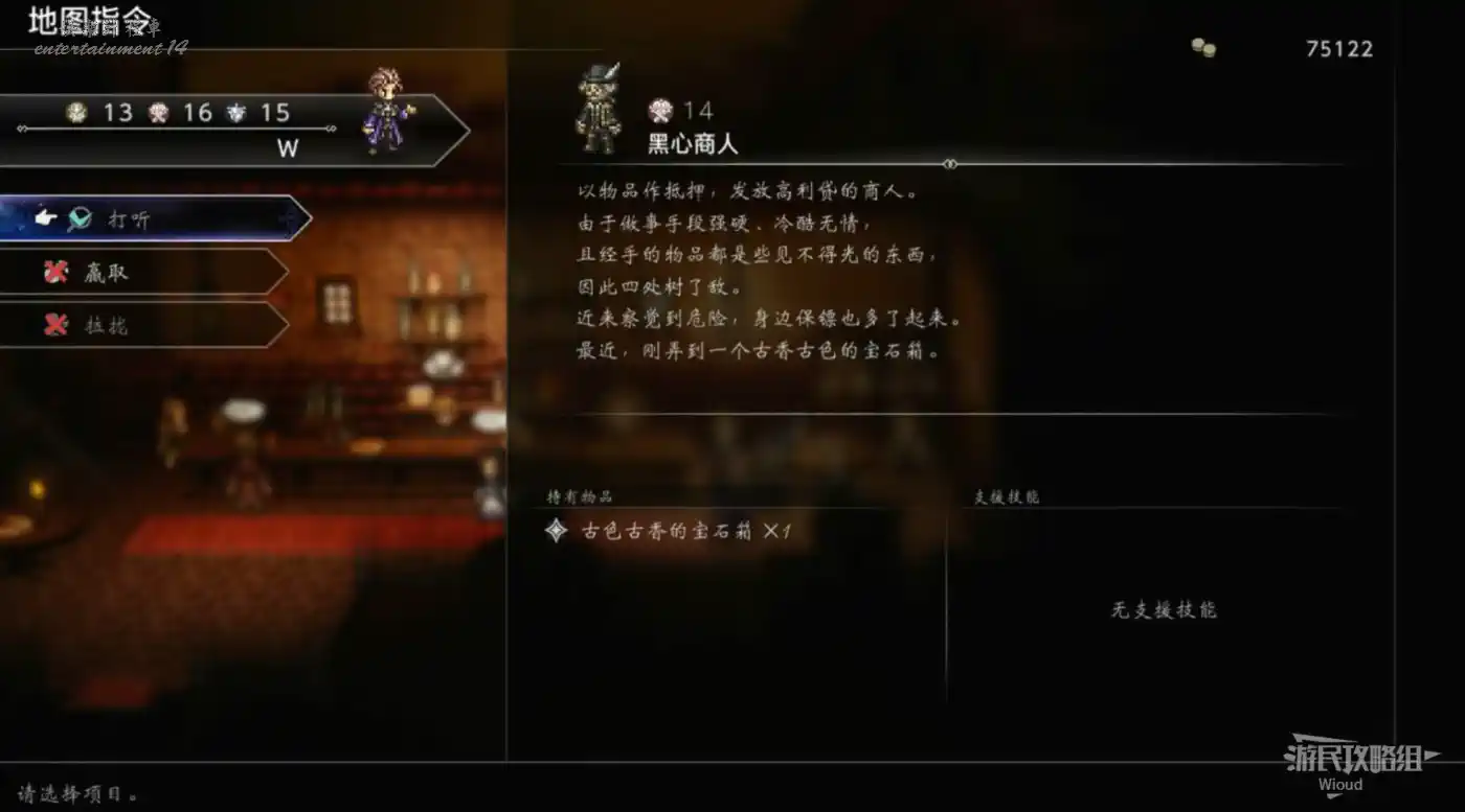 完事去城鎮的右上角找貴族對話,再回到酒館打聽商人消息,再贏取商人獲得【古色古香的寶石箱】。