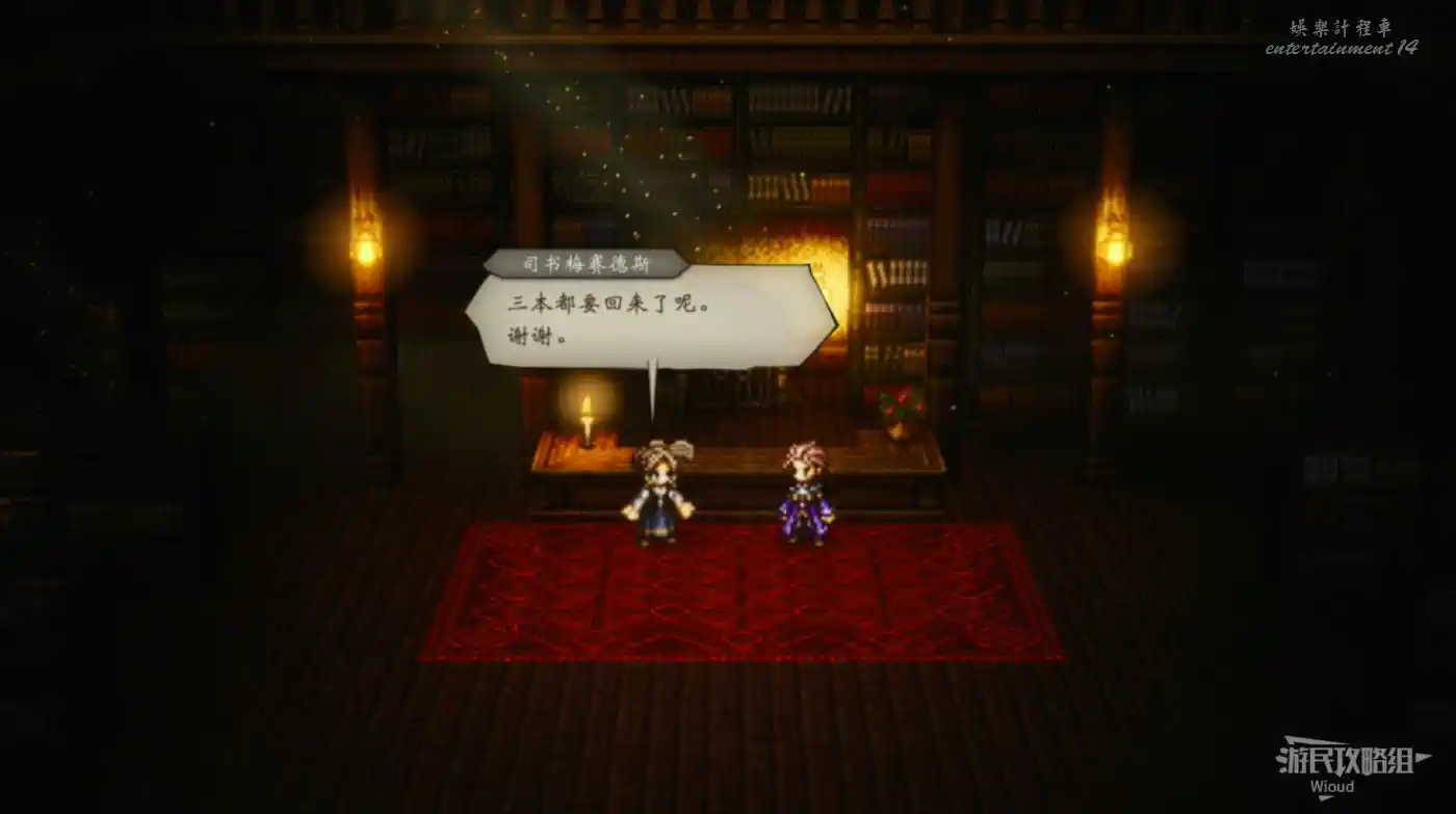 到達圖書館,在書架上拿到一個【書信碎片】,和左邊橙色對話方塊的【阿蕾可西雅】對話,打聽生平後索要【阿蕾可西雅魔術論考】。