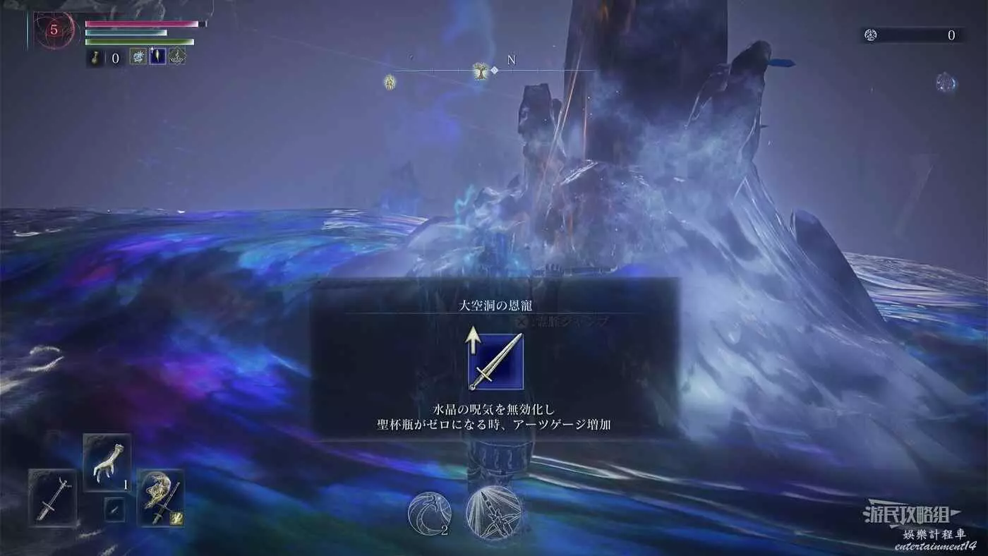- 恩惠:【大空洞的恩惠】讓水晶的詛咒氣息失效、聖盃瓶數量歸零時,能累積絕招量表
